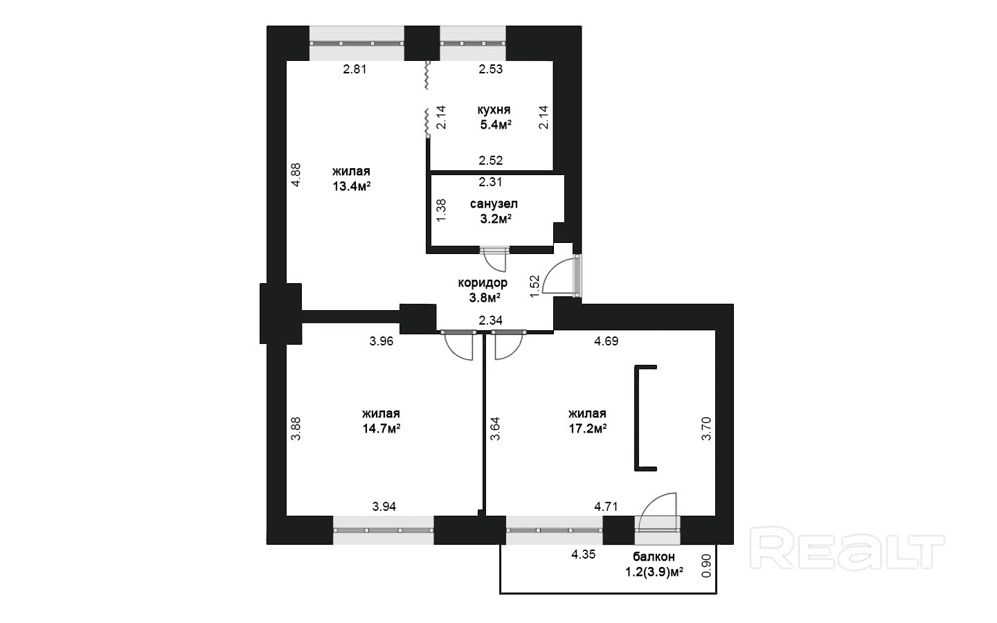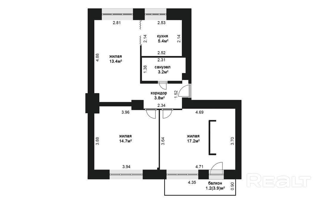 Квартира находится на третьем этаже. Ее общая площадь — 59 квадратов. На жилую площадь приходится 46 метров, на кухню — еще 5.