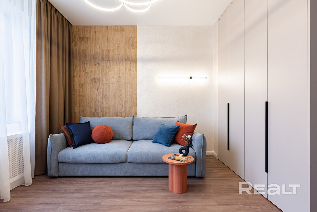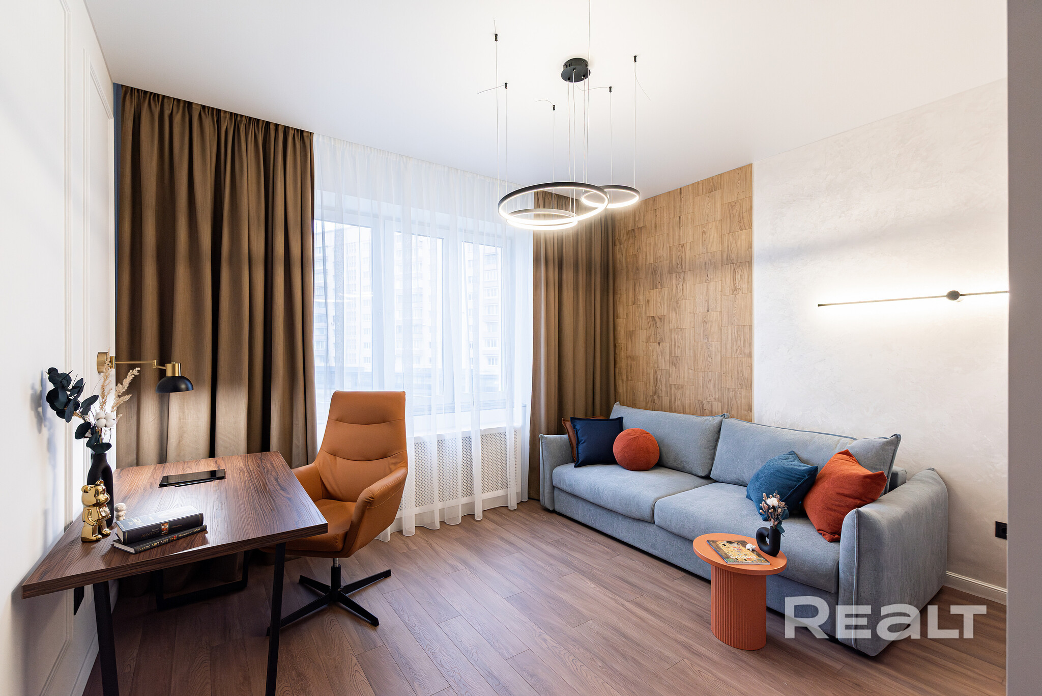 Еще в одной жилой комнате оборудовали кабинет: здесь есть рабочее место и второй диван.