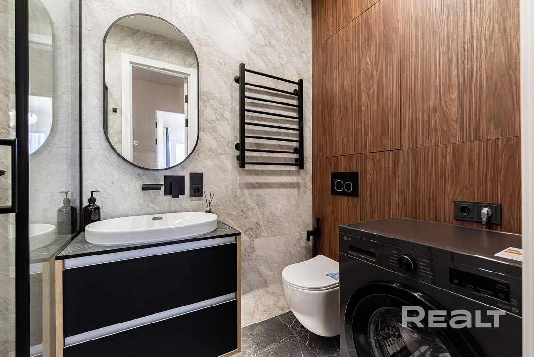 Санузел в трешке совмещенный. Там установлена душевая кабина и подключена стиральная машина.
