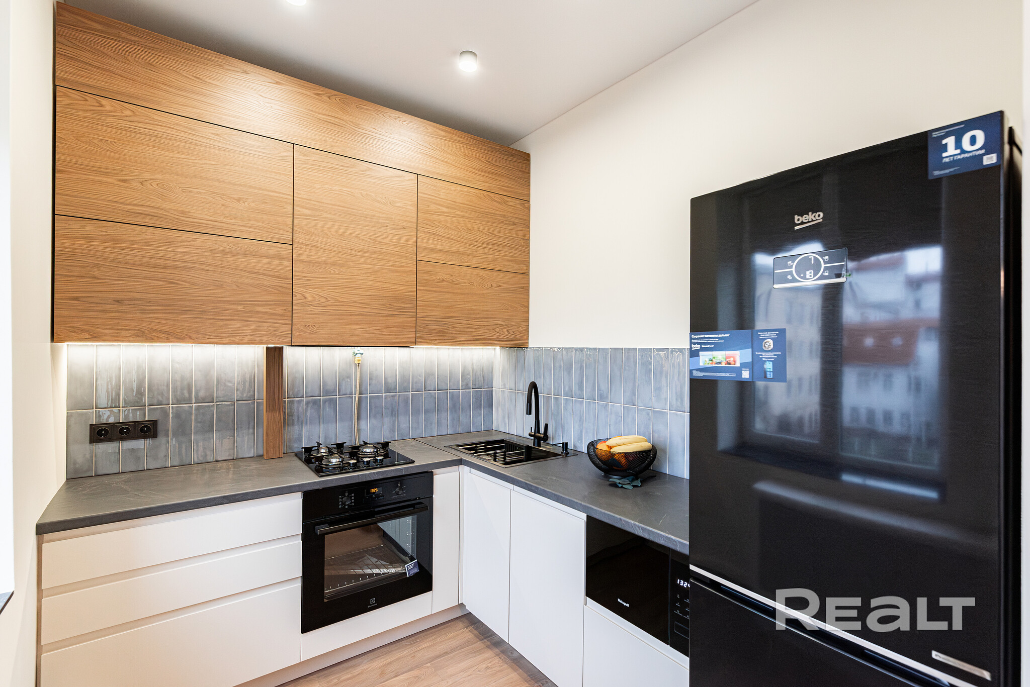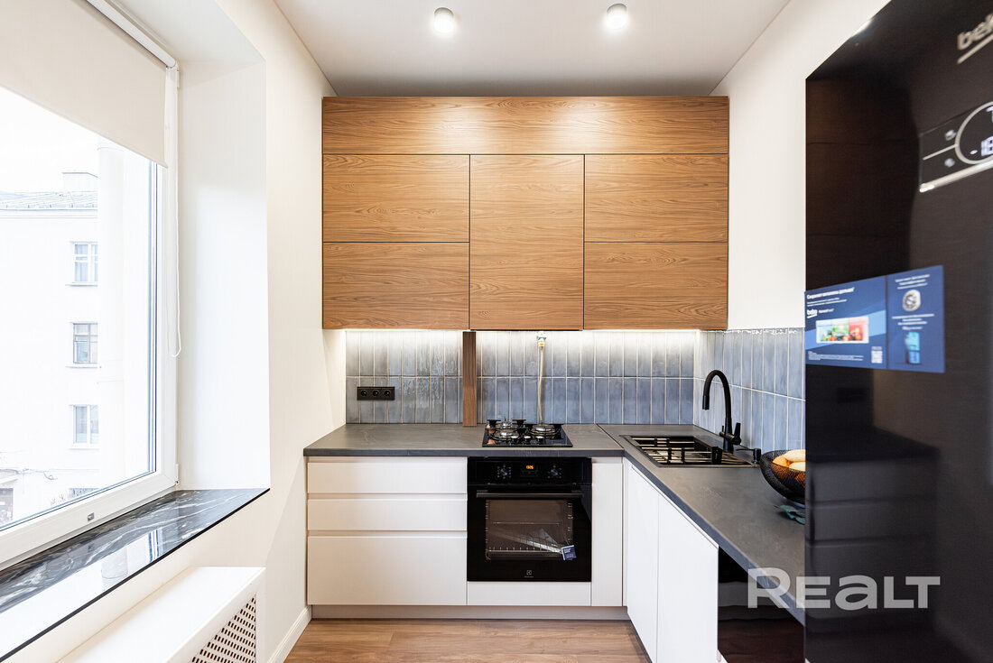 Ремонт в квартире выполнен в едином стиле. Нижние кухонные фасады выполнены в светлом оттенке, верхние повторяют текстуру дерева. Из техники есть духовой шкаф, варочная панель, холодильник. Видно, что вся техника новая: с нее даже не снимали наклейки.