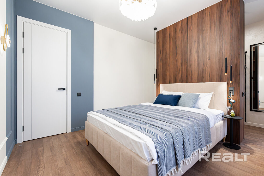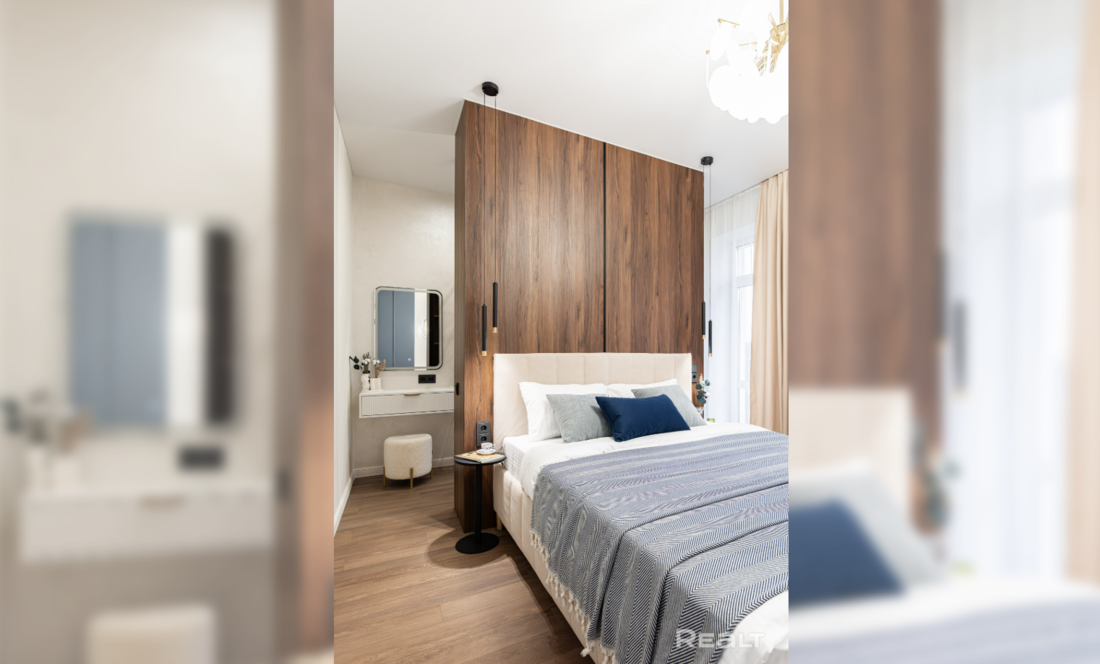 В спальне стоит большая кровать, а за перегородкой спрятан туалетный столик.