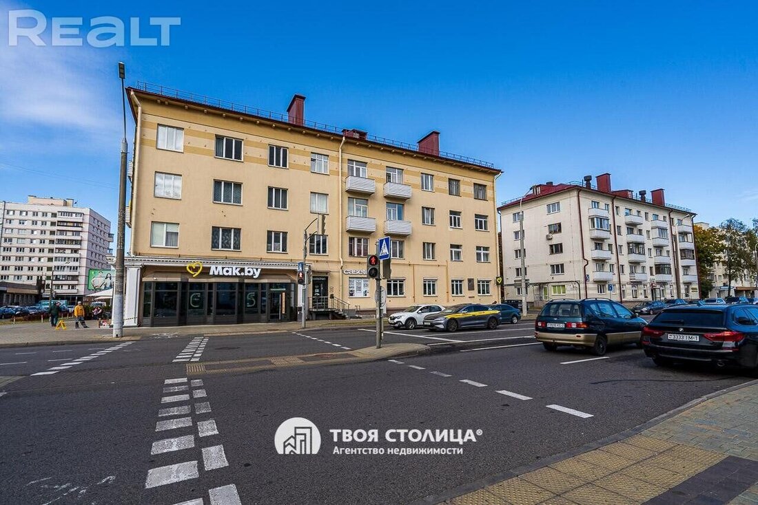 На первом этаже разместились кофейня Varka и Mak.by. В соседнем доме есть просторный продуктовый магазин, в шаговой доступности — две станции метро — «Фрунзенская» и «Юбилейная площадь».
