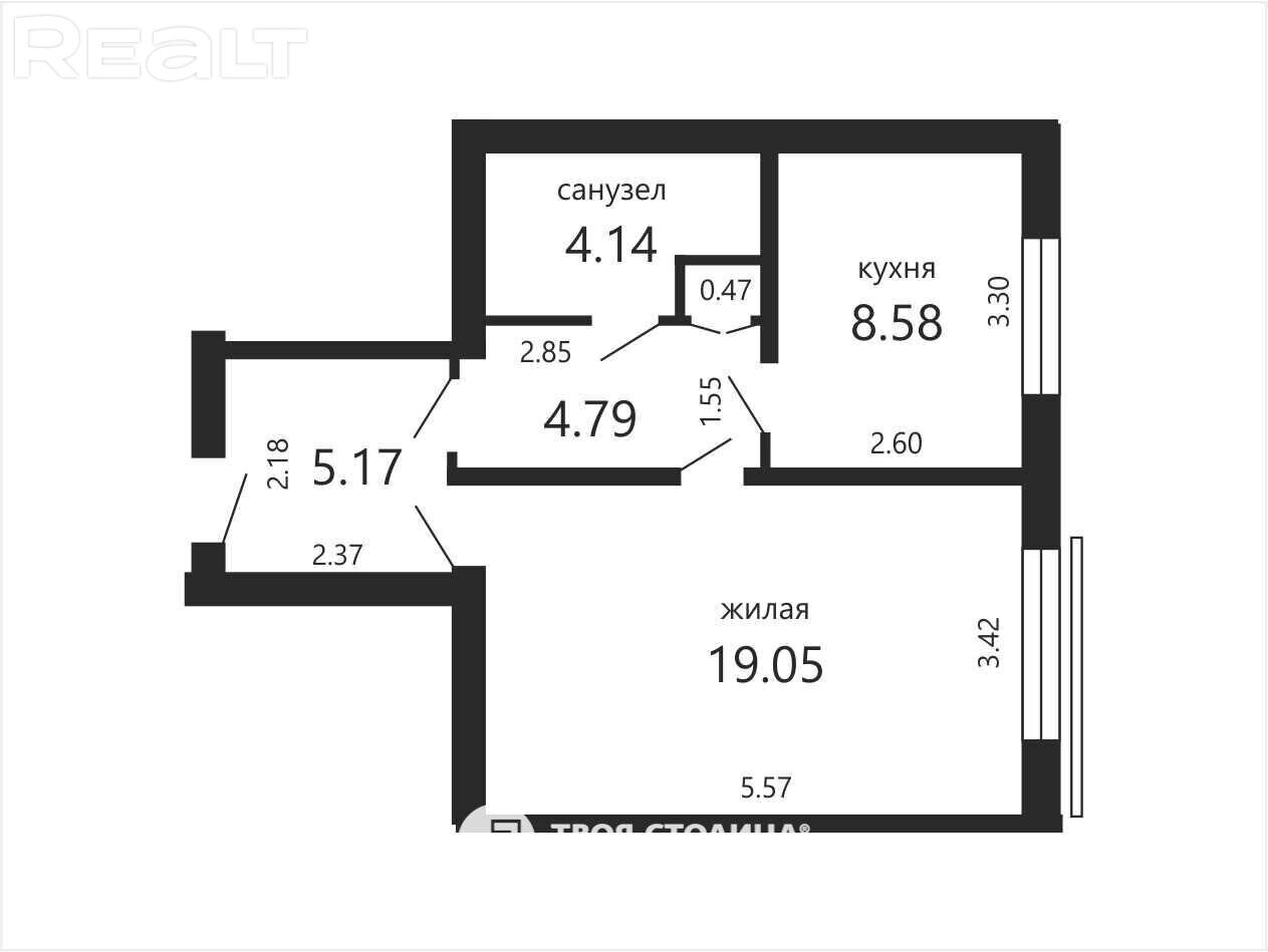 Квартира располагается в четырехэтажной сталинке на Максима Танка, 2. Дом 1959 года постройки, в 2020-м там прошел капремонт. Однушка находится на последнем уровне и занимает 42,2 квадратного метра.