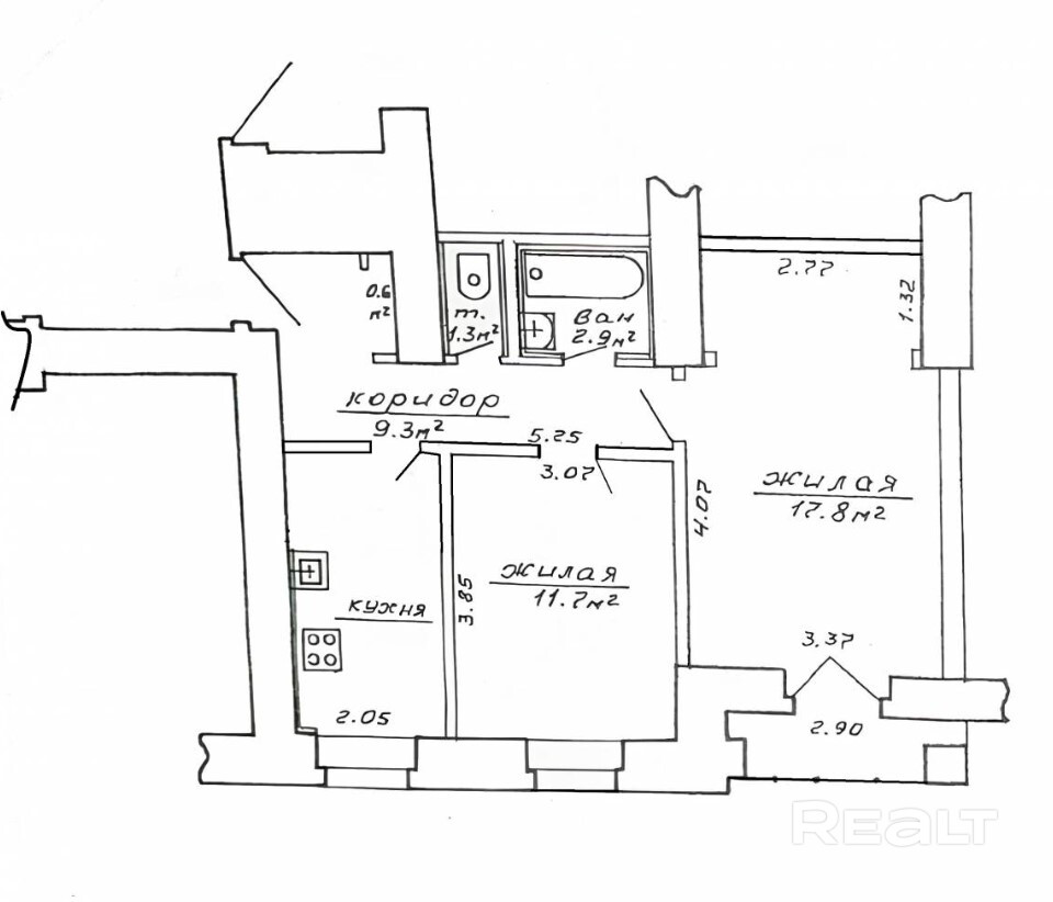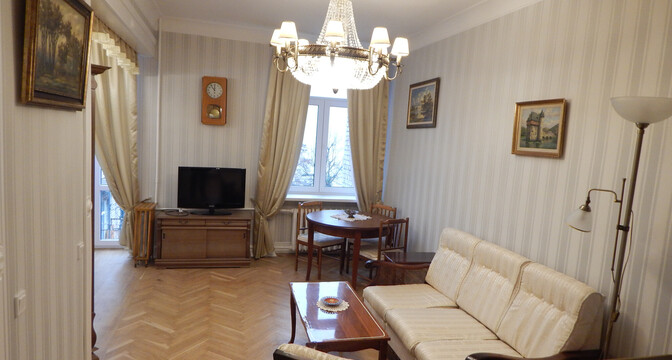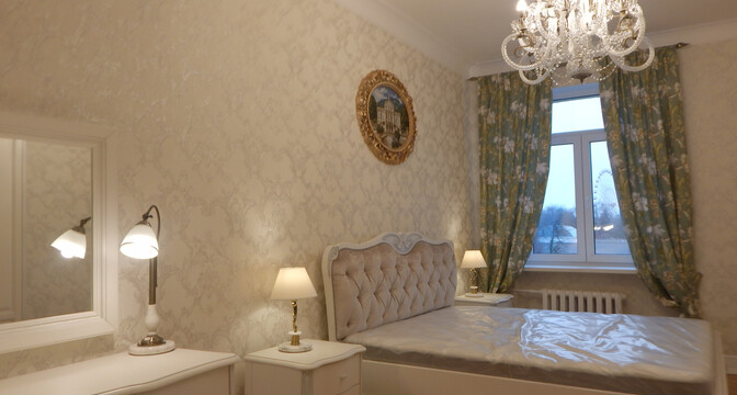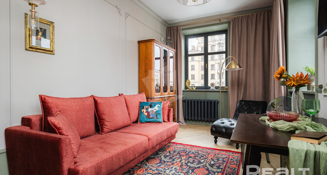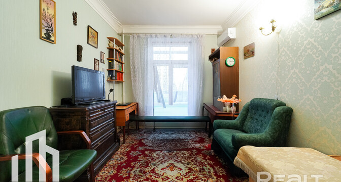 В одной жилой комнате оборудована гостиная, а во второй — спальня. В гостиной есть выход на аутентичный балкон. Санузел в квартире раздельный, есть ванна.