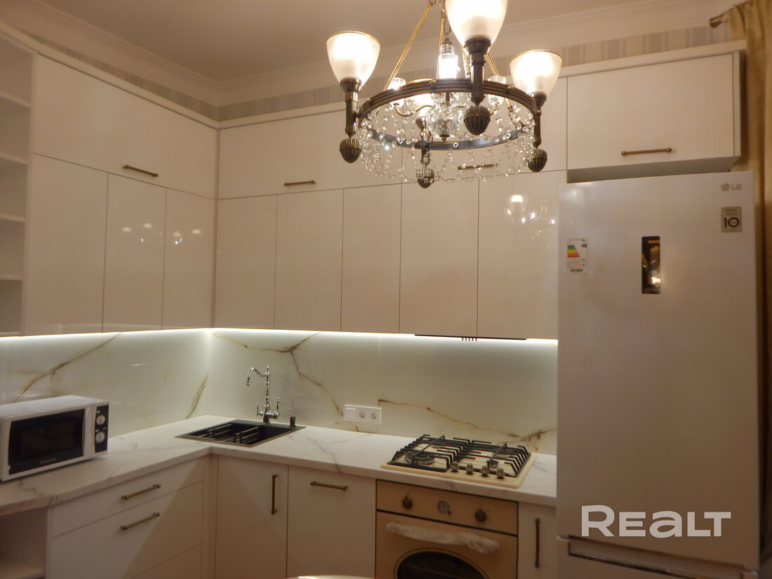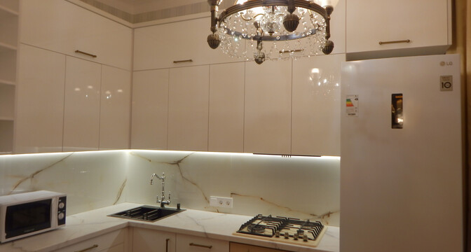 В двушке аккуратный ремонт в классическом стиле. В кухне из техники есть посудомоечная машина, духовой шкаф, варочная панель и холодильник.