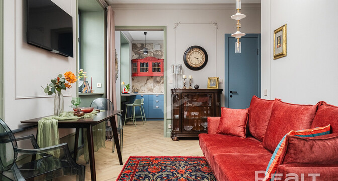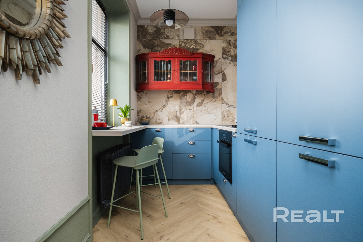 В двушке выполнен неординарный ремонт, в котором гармонируют винтажные элементы и яркие глубокие цвета. Кухонные фасады выполнены в голубом цвете, который гармонично контрастирует с ярко-красным винтажным буфетом. Столешница переходит в подоконник, который выполнен в качестве барной стойки.