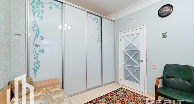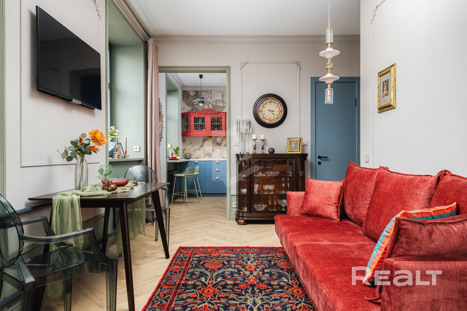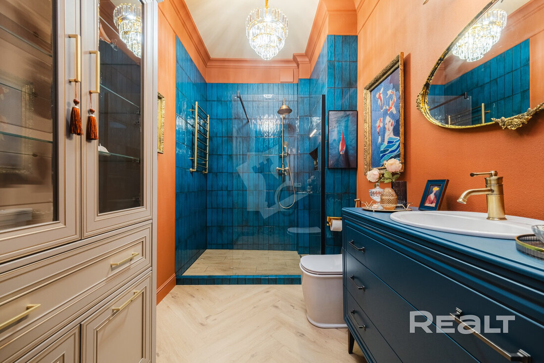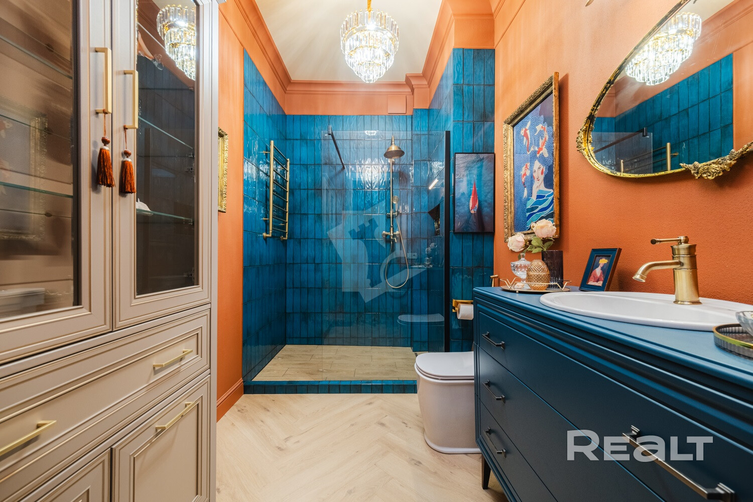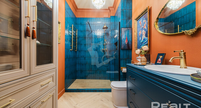 Стены в гостиной оформлены молдингами. В комнате три окна. Из мебели есть яркий диван, кресло с торшером и винтажный буфет. В спальне оборудованы лаконичные встроенные шкафы и стоит двуспальная кровать. В ярких контрастных цветах выполнен и санузел. Он в этой квартире совмещенный. Установлена душевая.