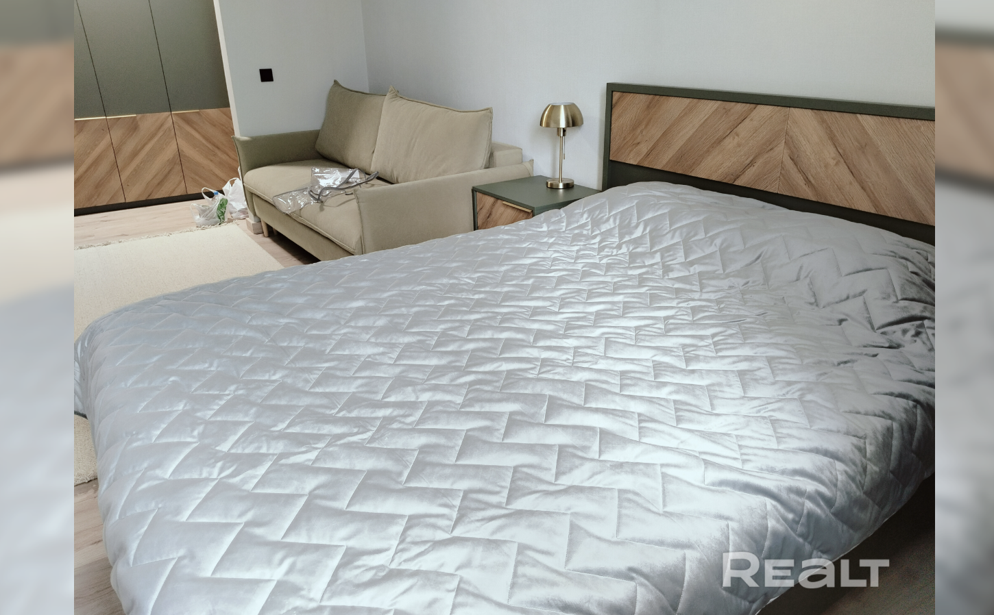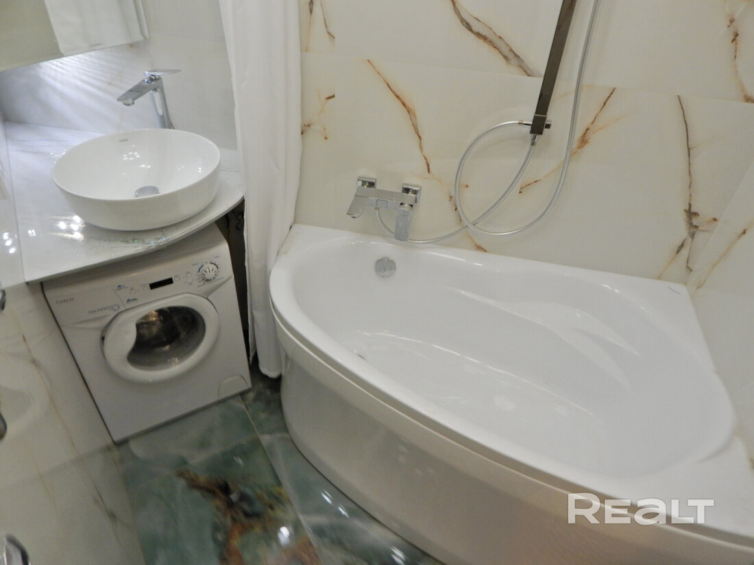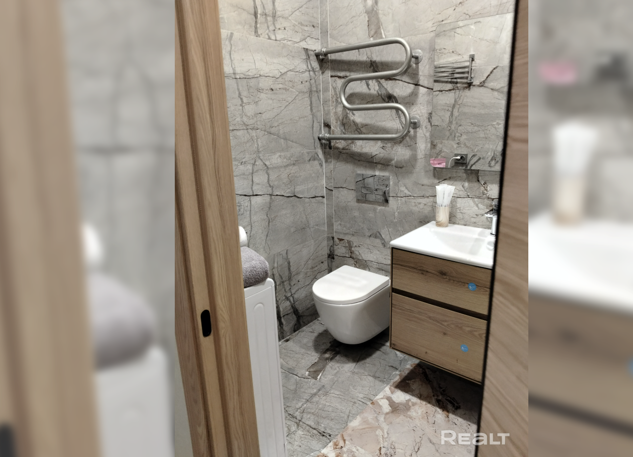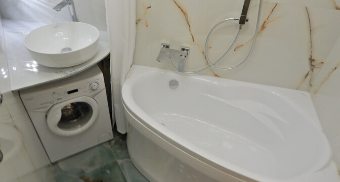 Здесь сделали современный ремонт. В жилой комнате однушки получилось разместить и гостиную зону, и поставить двуспальную кровать. В совмещенном санузле установили душевую кабину и подключили стиральную машину. Вот как все выглядит.