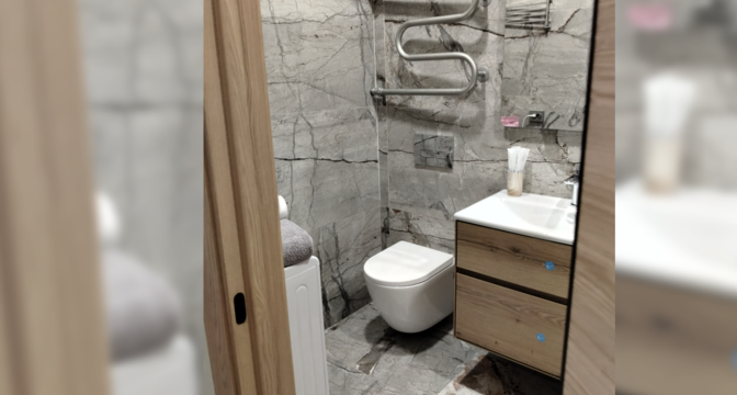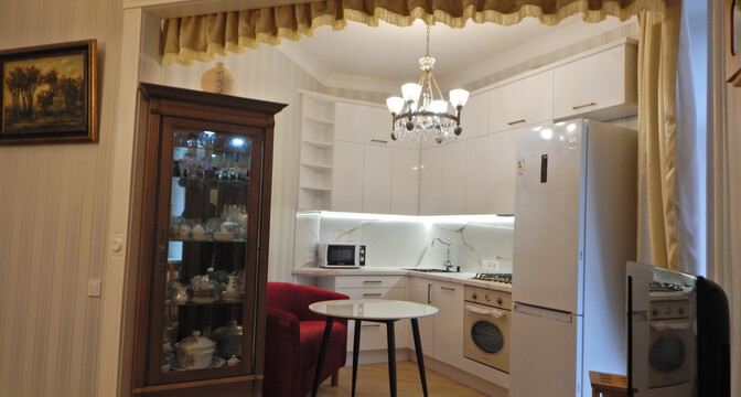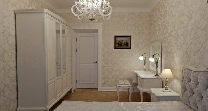 Продавец говорит, что после ремонта в квартире никто не жил. Потолки в двушке трехметровые, на них сохранилась лепнина. Полы паркетные, а межкомнатные двери выполнены из массива ольхи. Вся электрическая проводка заменена на медную. Санузел совмещенный. Установлена большая ванна и подключена стиральная машина.