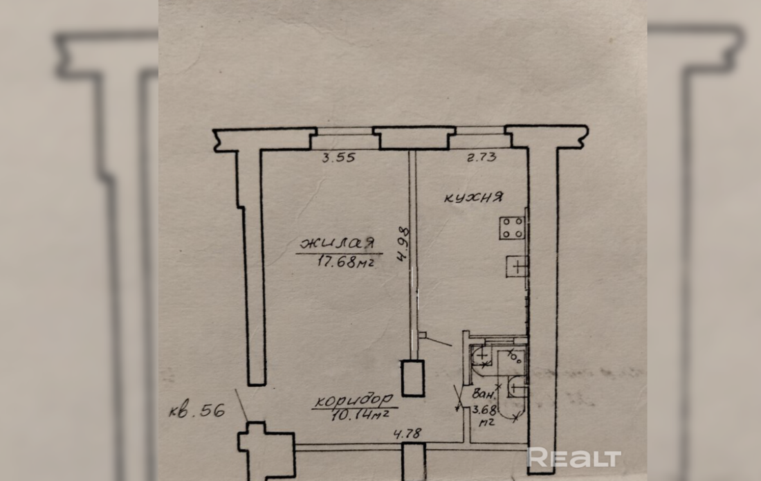 В квартире планировка нестандартной формы. Общая площадь — 56 квадратов. Из них 37 жилых, а еще 8 приходится на кухню.