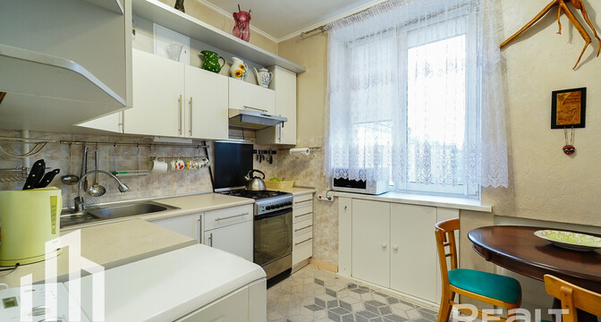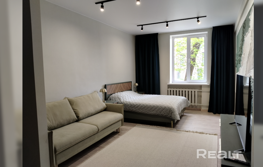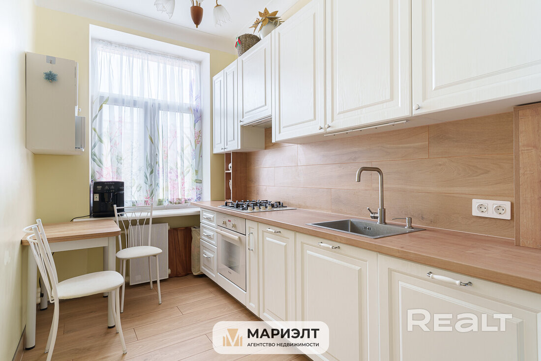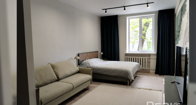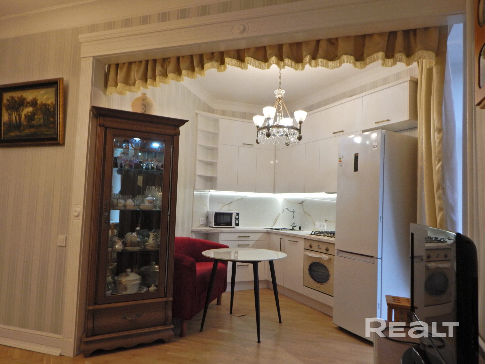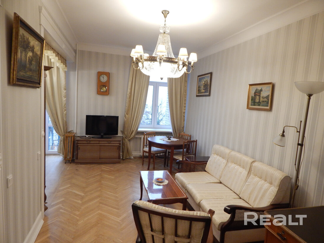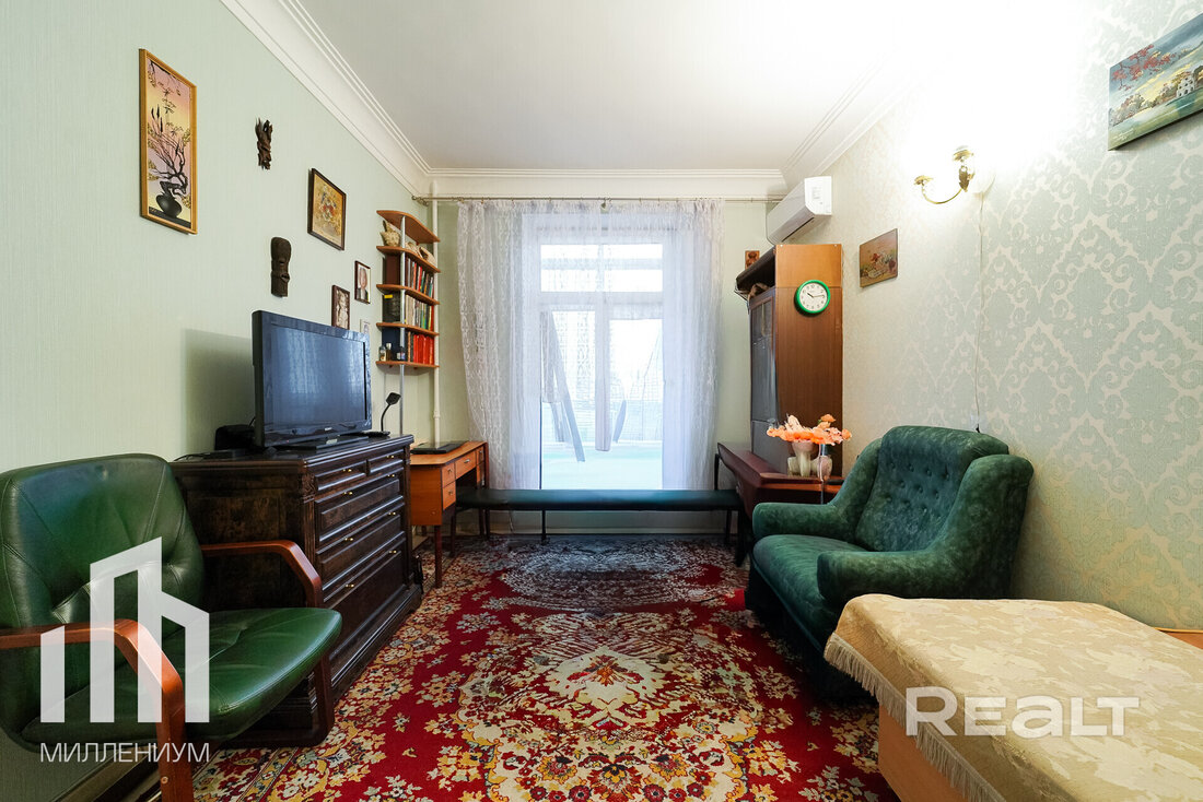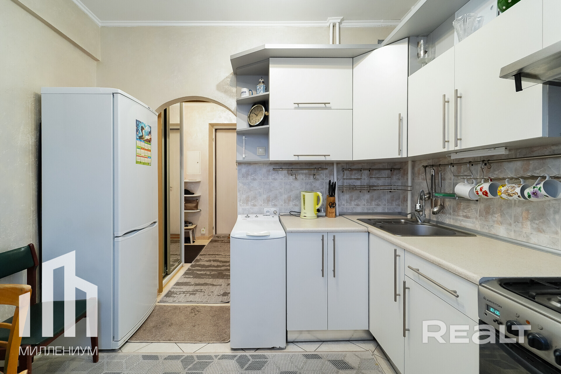 За эти же деньги можно купить двухкомнатную квартиру в доме со словами «Подвиг народа». Это сталинка у самого входа в метро, ее адрес — проспект Независимости, 37.