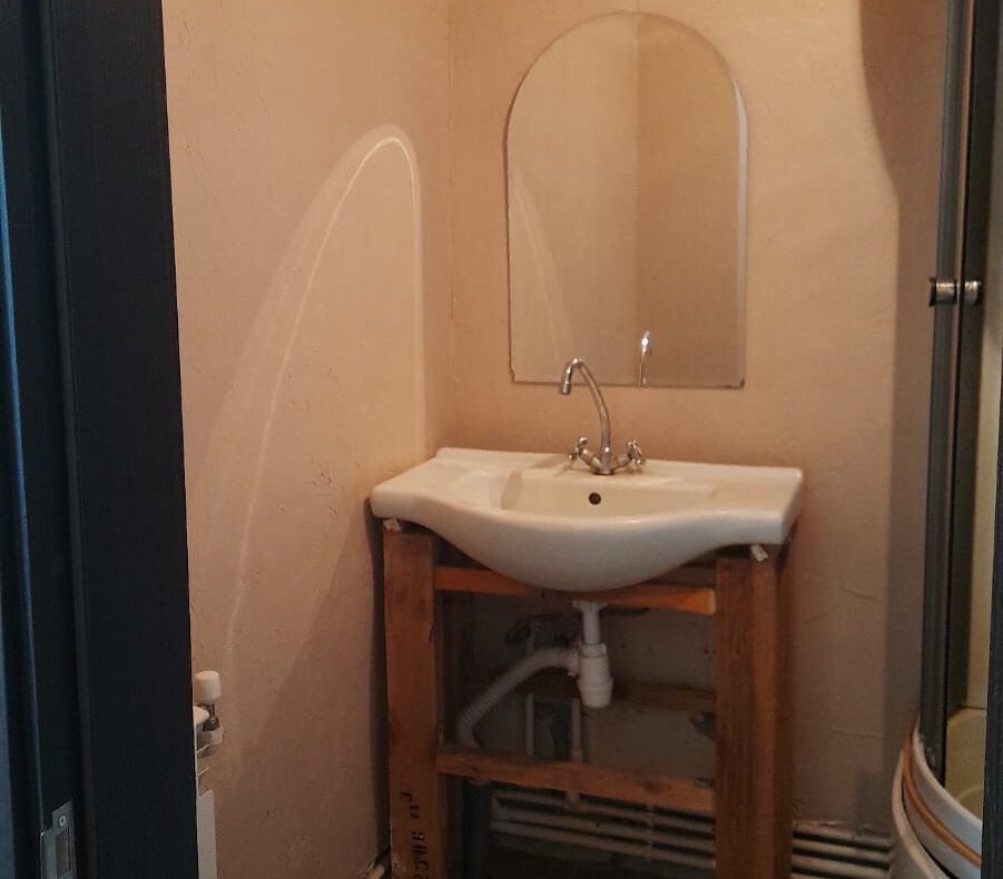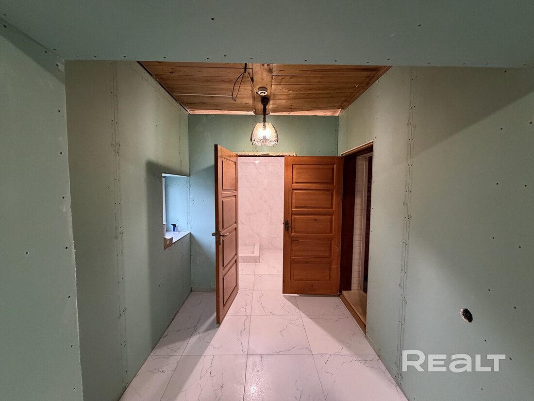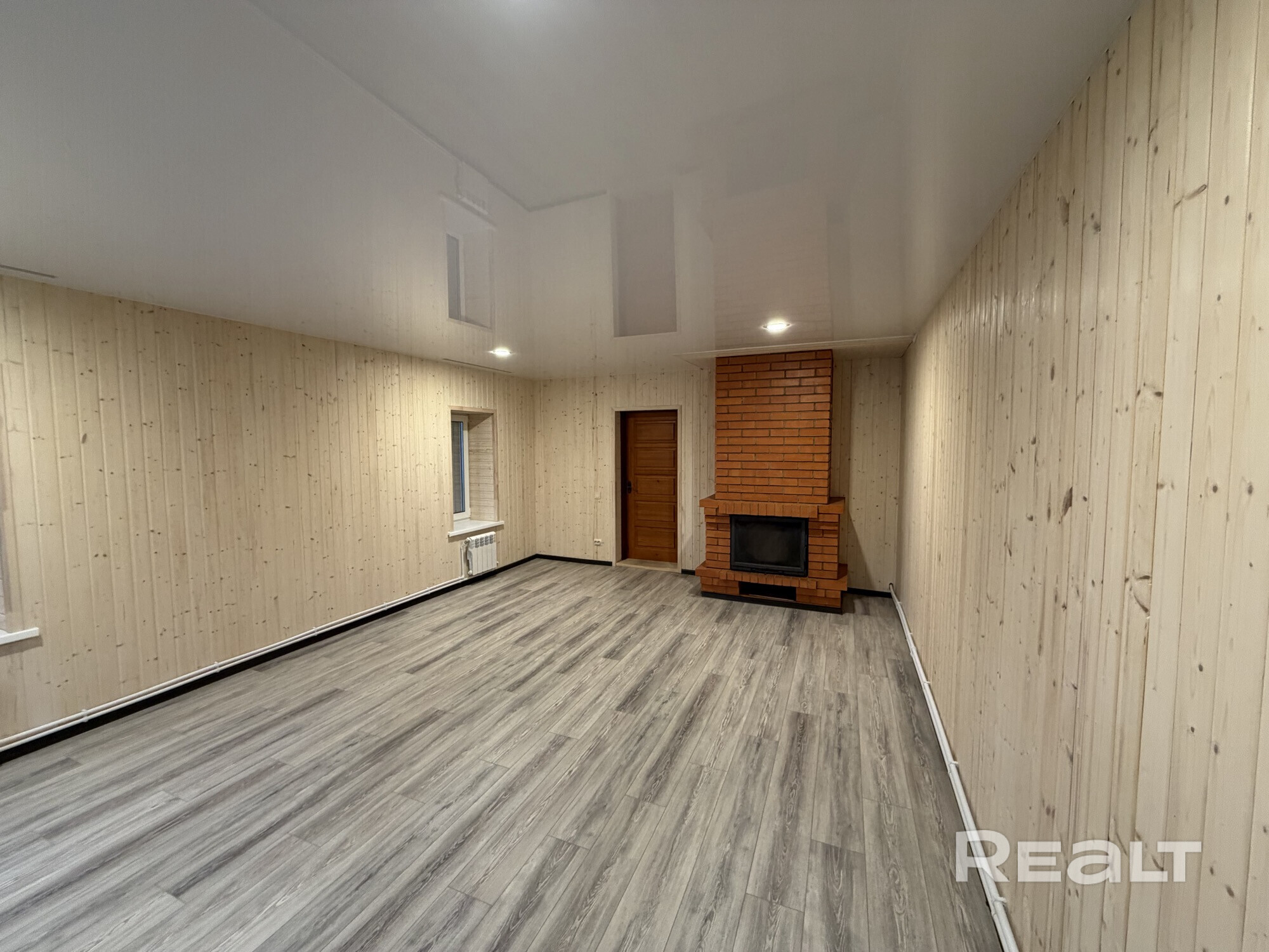 Внутри дом обшит карельской евровагонкой, на полу ламинат, потолки натяжные. В большой комнате сложен камин. Заменена вся электрическая проводка. В санузле стены облицованы керамической плиткой. Теплые полы сделаны в санузле, коридоре и кухне.
