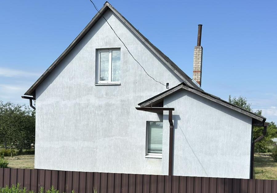 Дом здесь из блоков, год постройки 2012-й. Фасад утеплен, оштукатурен и покрашен. На крыше — шифер.