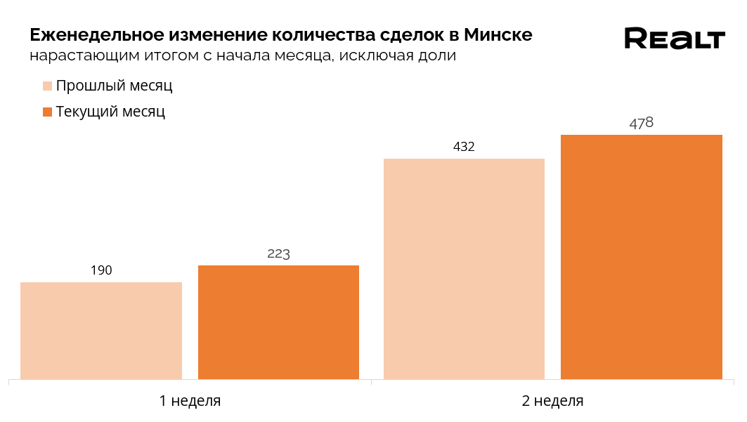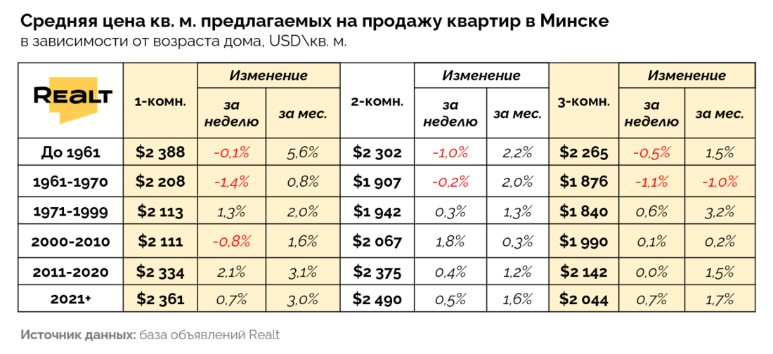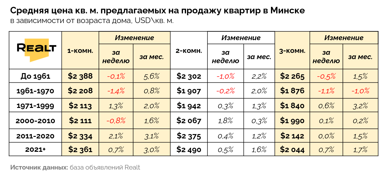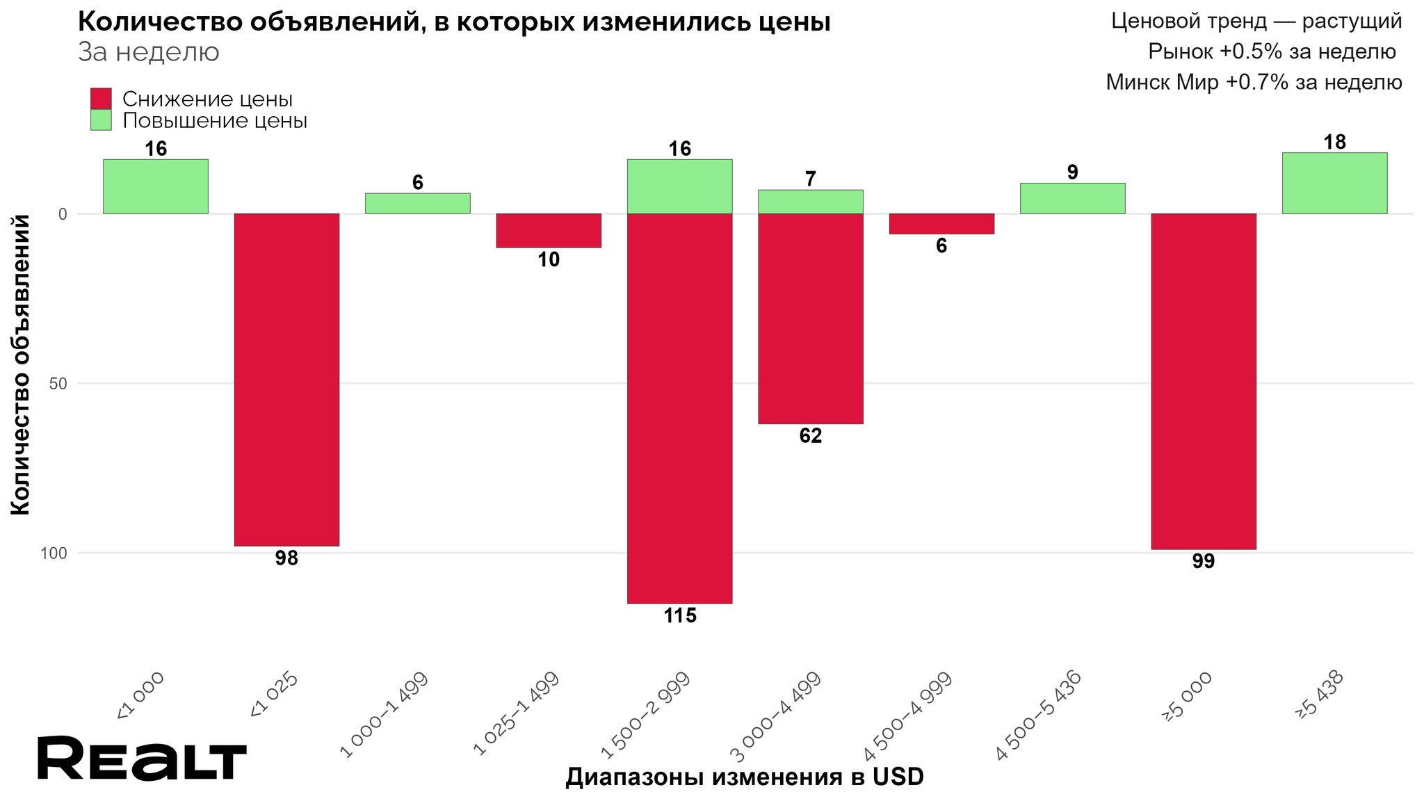 Если посчитать изменение цен по уже находившимся в продаже на прошлой неделе квартирам, то получим снижение цены в среднем на -2%. В то же время из-за новых объявлений, итоговый показатель за прошлую неделю показал прирост +0,5% до 2113 $\кв. м.