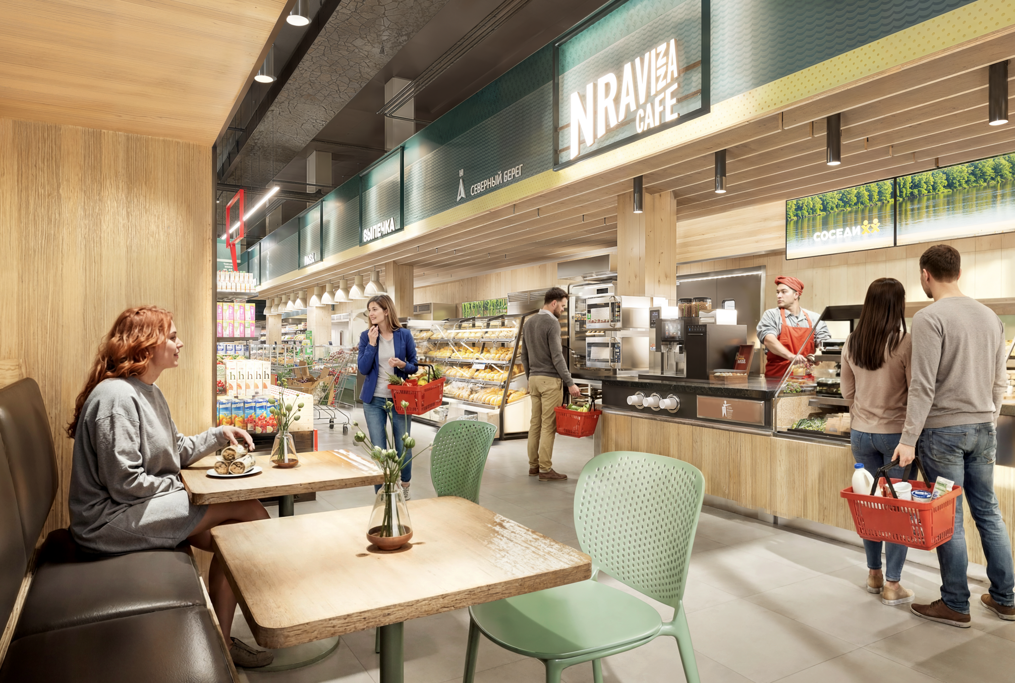 На территории супермаркета откроется Nravizza Café с современной зоной посадки. Здесь будут представлены пиццы и бургеры, суши, кофе и напитки.