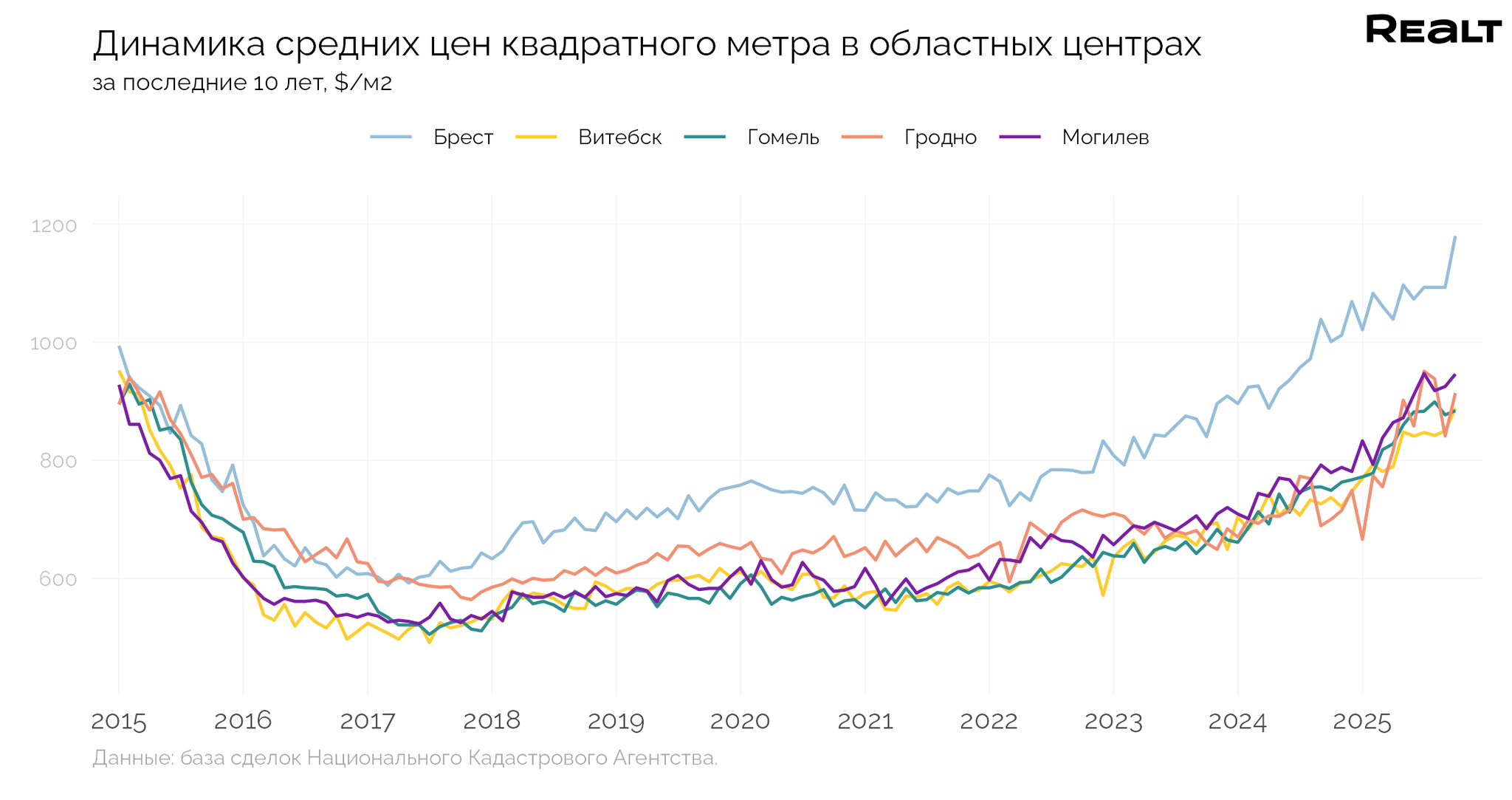 Интересно посмотреть аналитику реальных сделок по Бресту. Текущий уровень цен (октябрь 2025 года) на 17,9% выше, чем в аналогичный период прошлого года:
