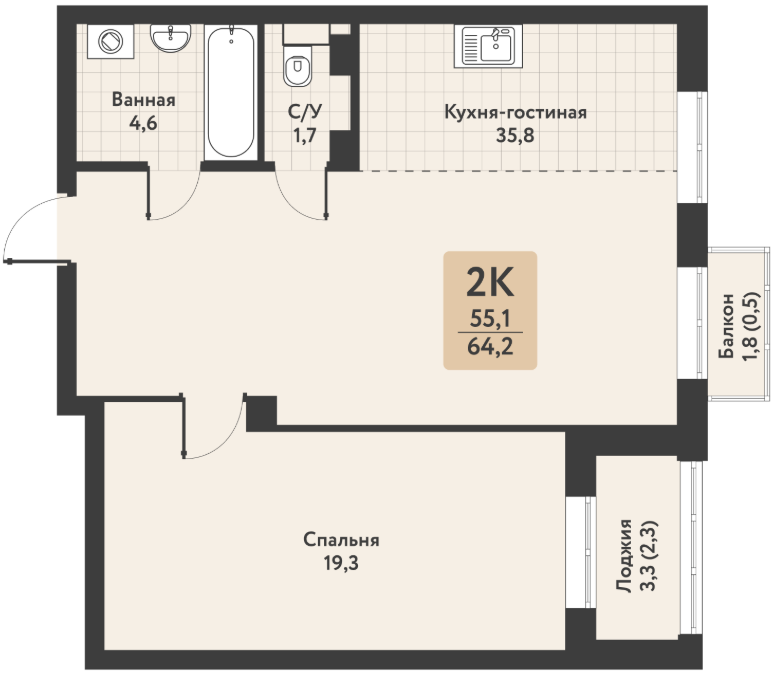 Застройщик предлагает большой выбор 2-комнатных квартир — от 46,7 до 67,1 м². Такая квартира площадью 64,2 м² с лоджией, балконом и раздельным санузлом позволяет с комфортом жить на постоянной основе. Спальня — целых 19,3 м², кухня-гостиная —роскошные 35,8 м². Эта квартира стоит 116 844 доллара.