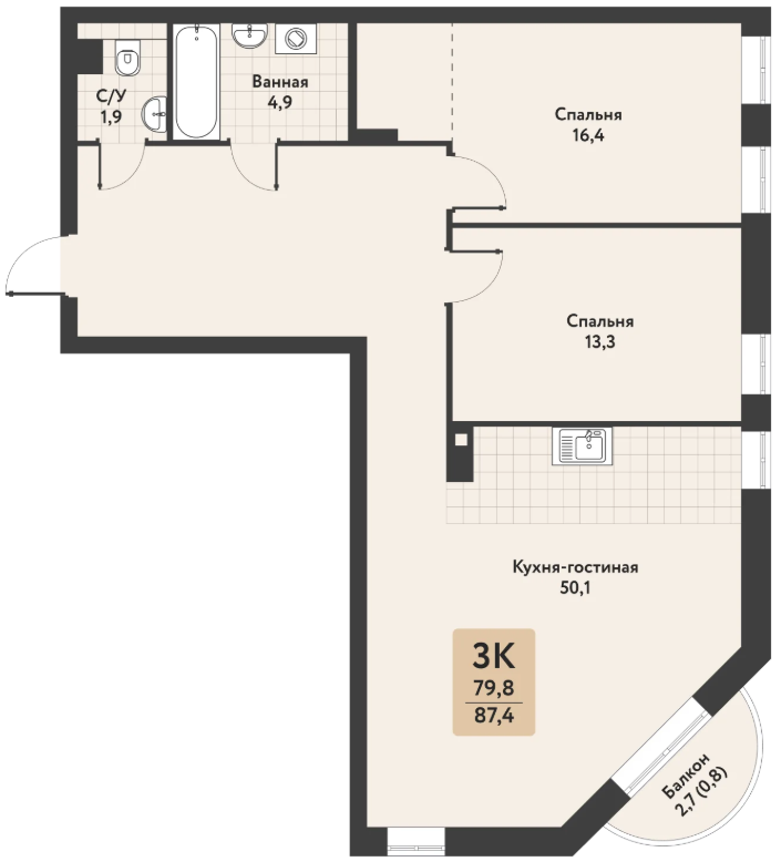 Немало и 3-комнатных квартир. Интересна планировка углового варианта. Площадь — 87,4 м², раздельный санузел, окна на две стороны, две спальни на 16,4 и 13,3 м². Кухня-гостиная занимает 50,1 м² и дополняется полукруглым балконом, с которого открывается вид на оживленные городские улицы.