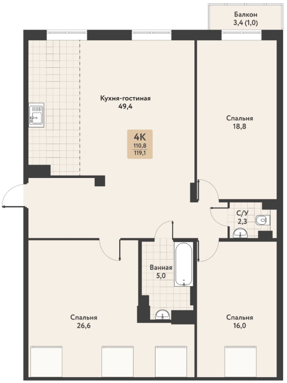 Для тех, кому актуальны 4-комнатные квартиры, есть 4 решения. Самая просторная квартира — на 119,1 м². Раздельный санузел, спальни на 26,6, 18,8 и 16 м², кухня-гостиная на 49,4 м² с балконом. Эта квартира стоит 196 515 долларов.