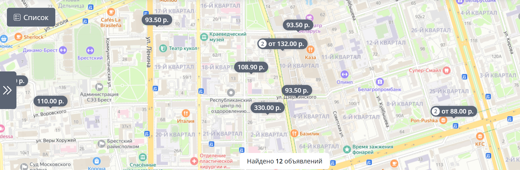 В результате на высоком уровне остаются цены на посуточную аренду. Посмотрим на данные сервиса Realt.Бронь. Квартира на сутки в кварталах, окружающих пешеходную улицу, стоит от 88 BYN. Несложно посчитать выручку за месяц — она может составить от 2 640 BYN.