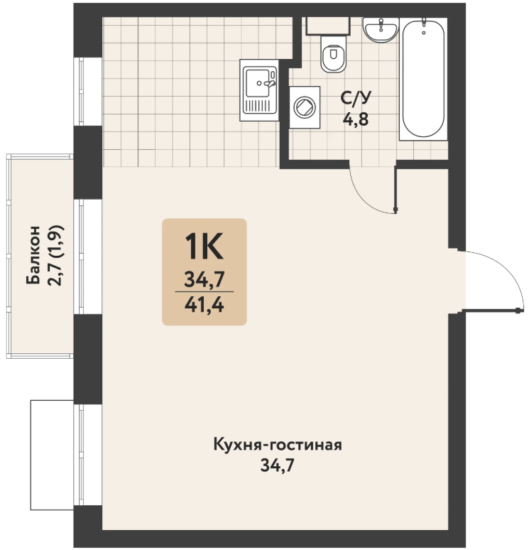 Рассмотрим несколько планировочных решений. Например, студия площадью 41,4 м². В квартире — два окна, балкон, санузел. Можно выделить зону отдыха, а также место для работы. Хороший вариант для инвестиций: квартира будет пользоваться спросом для аренды на сутки, также может быть интересна долгосрочным арендаторам. Ее стоимость — 79 488 долларов.