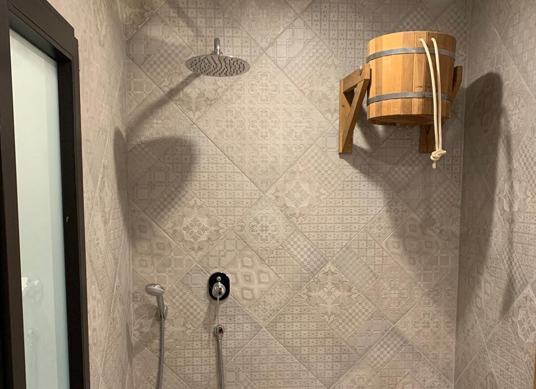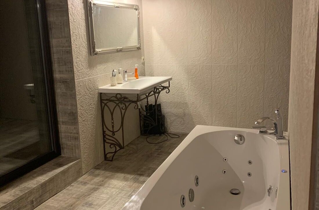 В доме интересный и необычный ремонт — в отделке активно использованы камень и дерево.