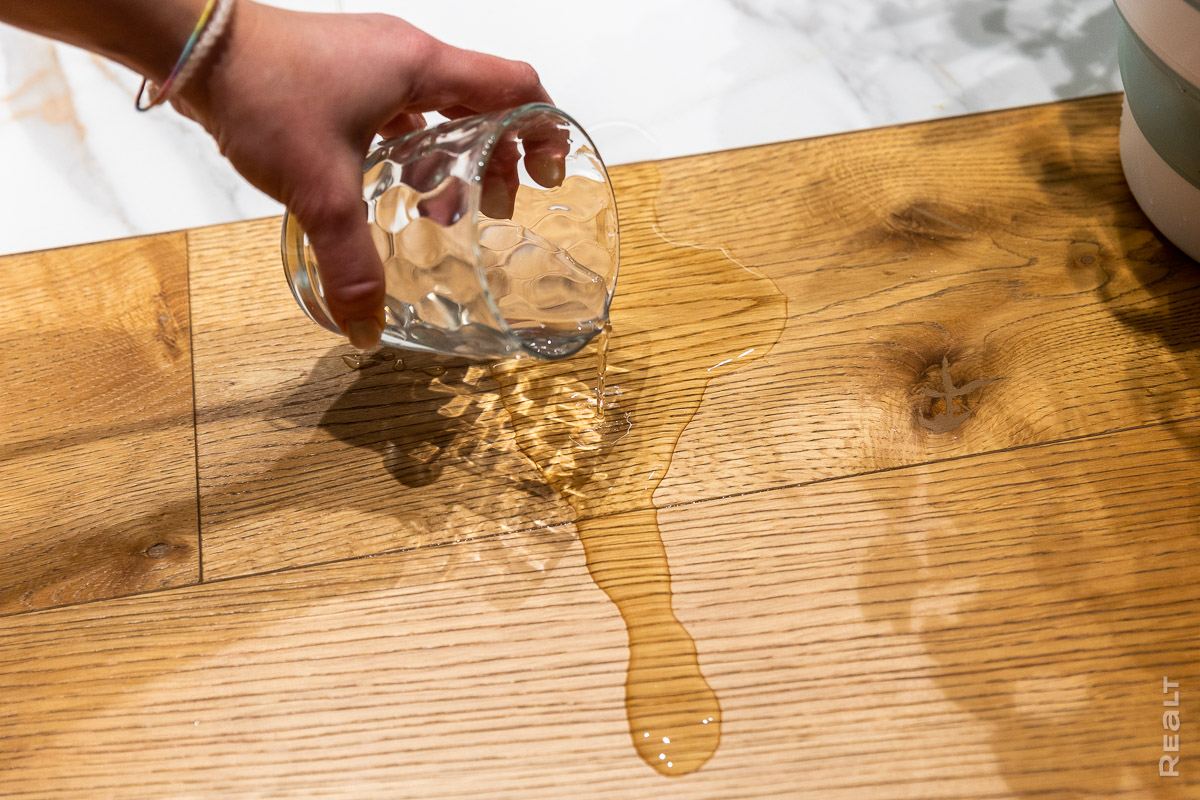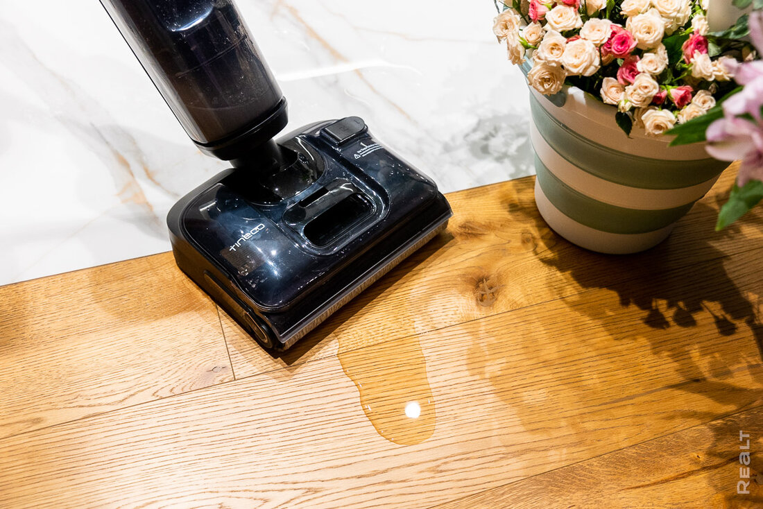 Жидкость на полу. Далее мы проверили пылесосы в режиме SUCTION. Мы специально пролили воду на пол, чтобы увидеть, как устройства справляются с жидкими загрязнениям. Как итог — место без луж и разводов, сразу сухое.