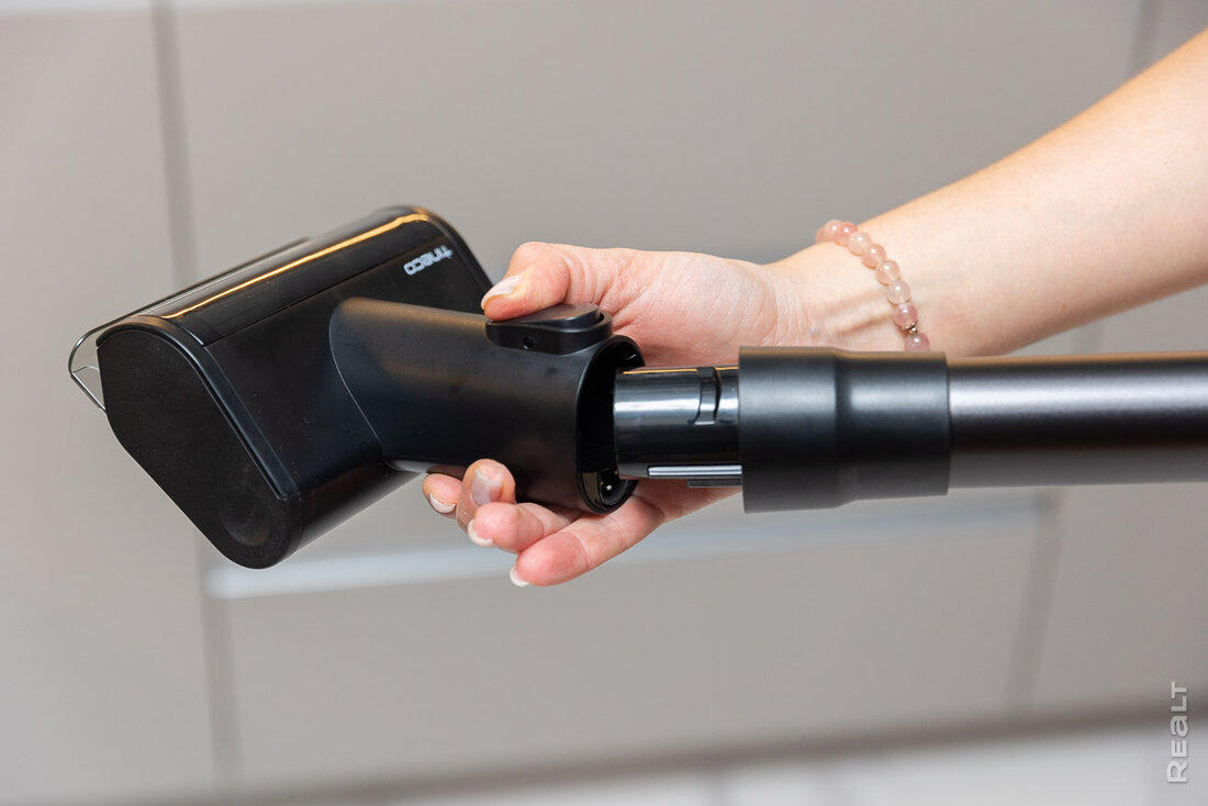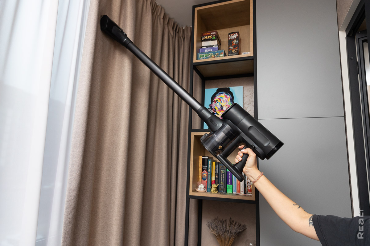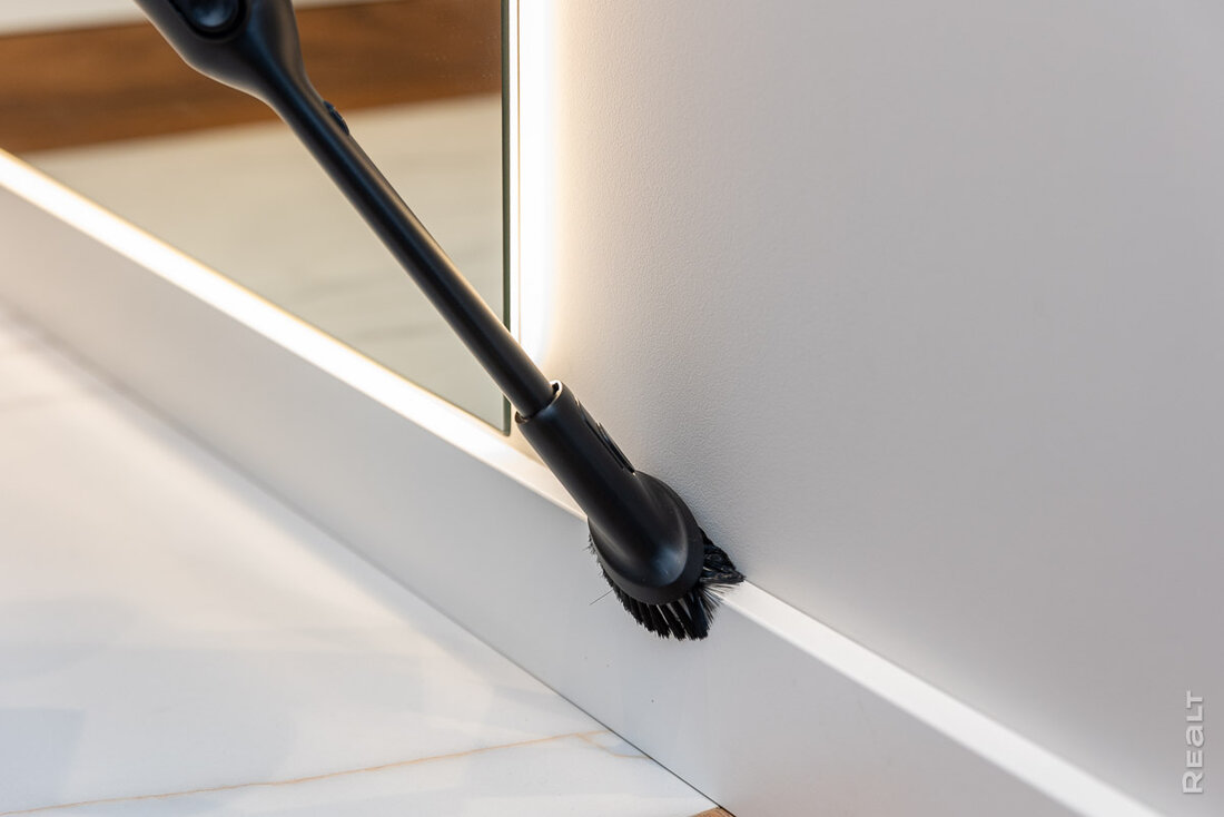Начали мы, как и рекомендуют профессионалы, с сухой уборки. Для этого использовали сухую версию S7 STRETCH со сменными насадками под разные зоны. Насадки меняются интуитивно и быстро. Длина регулируется, поэтому без стремянки удалось убрать пыль со штор, верхних полок и даже креплений под потолком.
