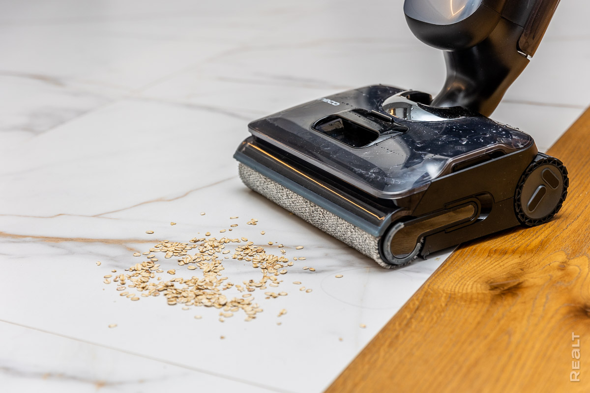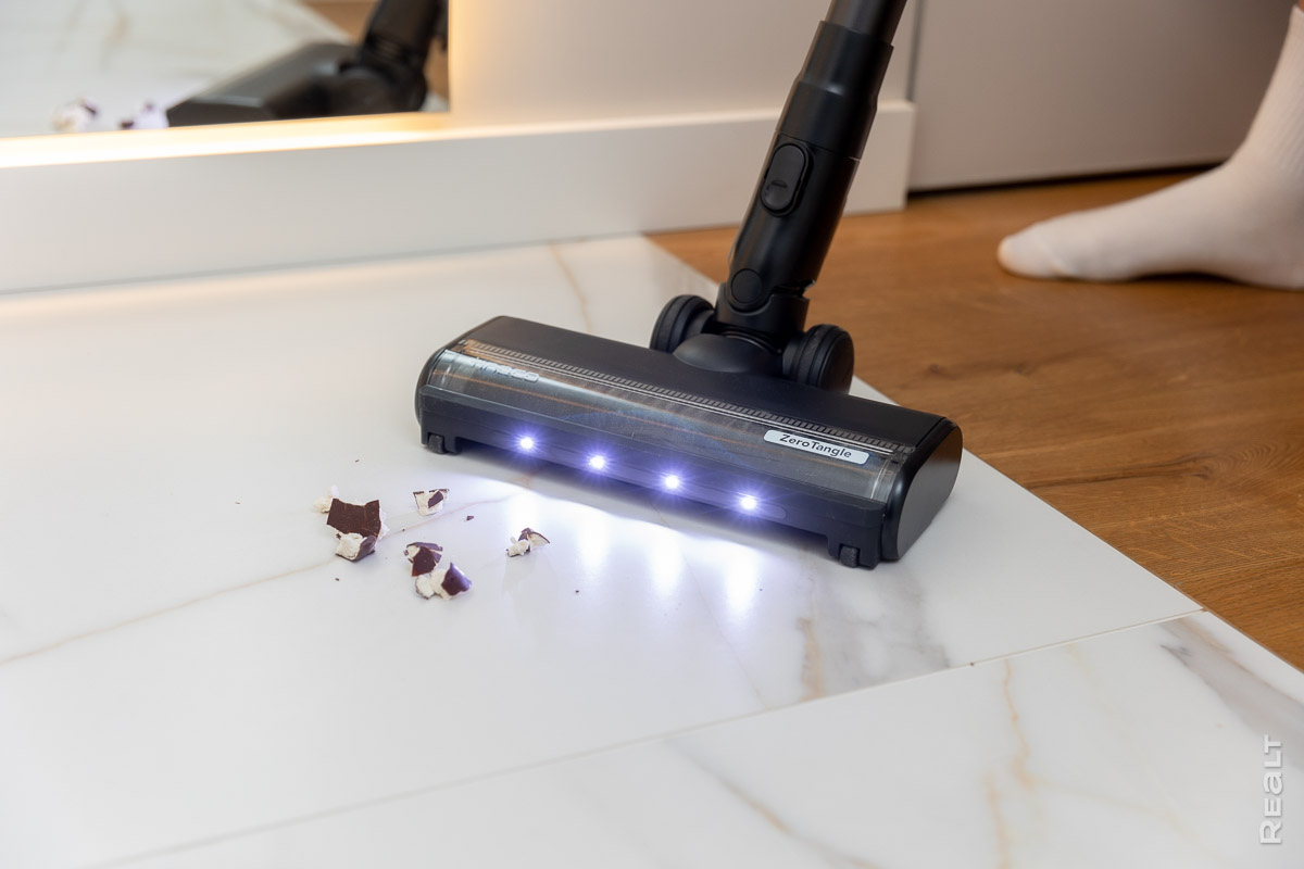 Мощность всасывания модели достигает 21 000 Па, поэтому с крошками, песком и сухими остатками еды проблем не возникает. Отдельно стоит отметить технологию DualBlock и щетку Tineco ZeroTangle — они предотвращают наматывание волос, что особенно важно для квартир с питомцами.