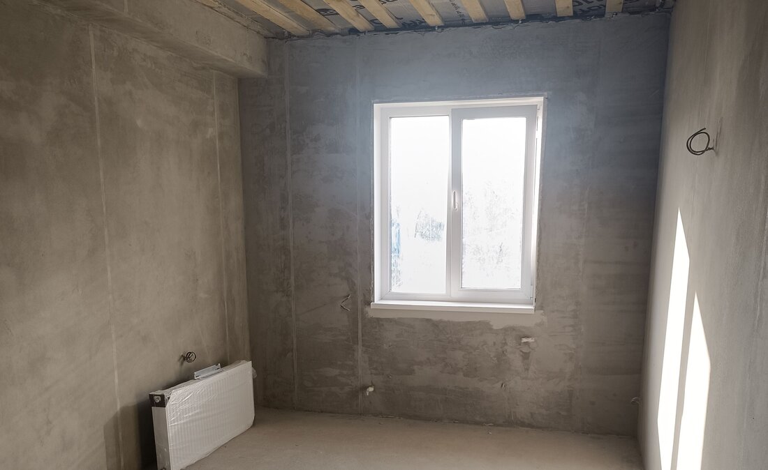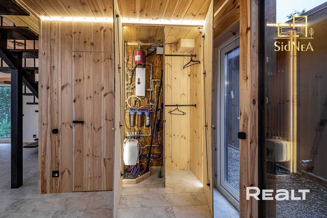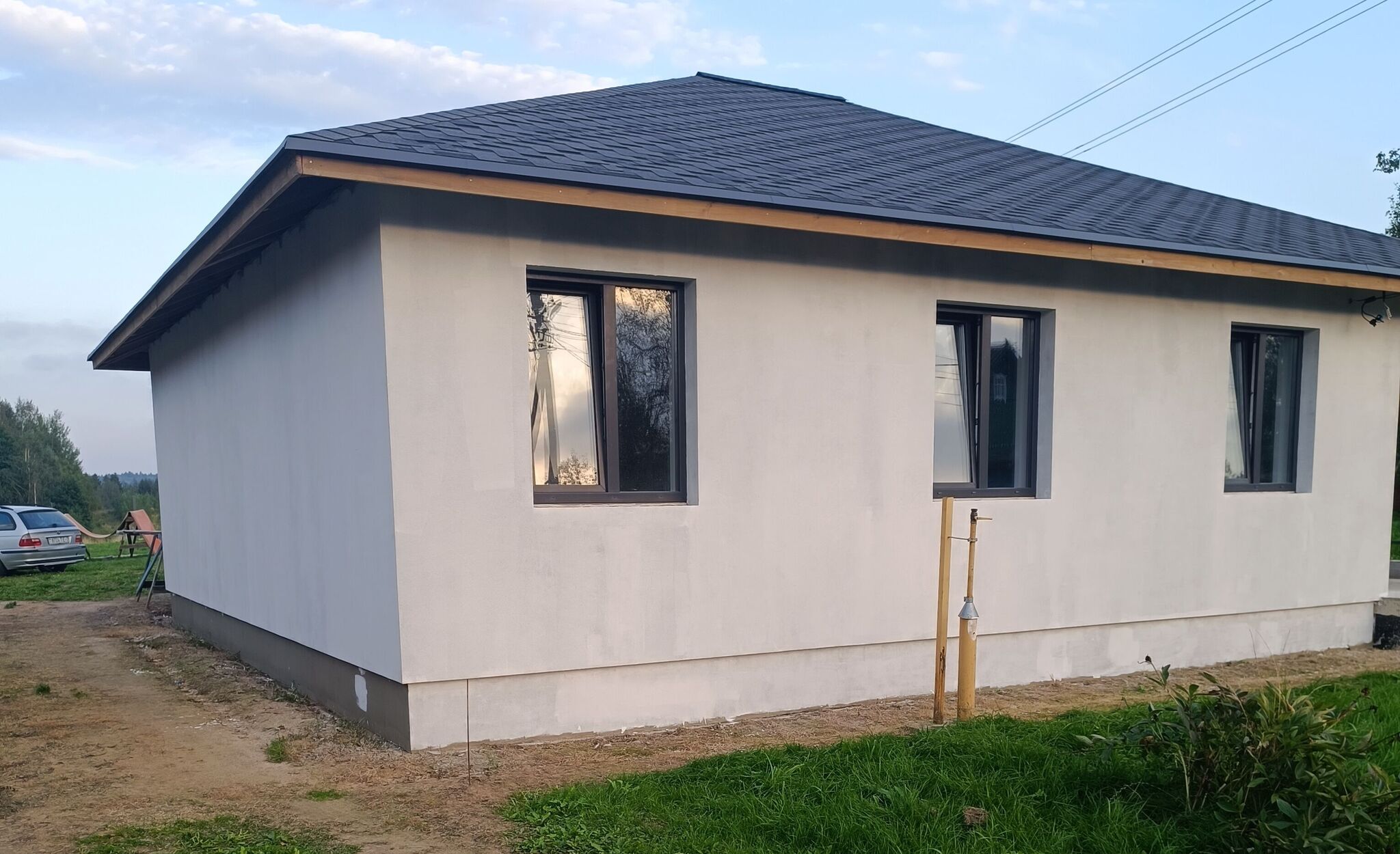 Общая площадь — 93 м2. В нем три раздельные комнаты, кухня-гостиная, раздельный санузел, котельная, прихожая. Из гостиной есть выход на террасу. Внутри все готово под чистовую отделку: электричество разведено, в стяжке — теплые полы, стены оштукатурены.