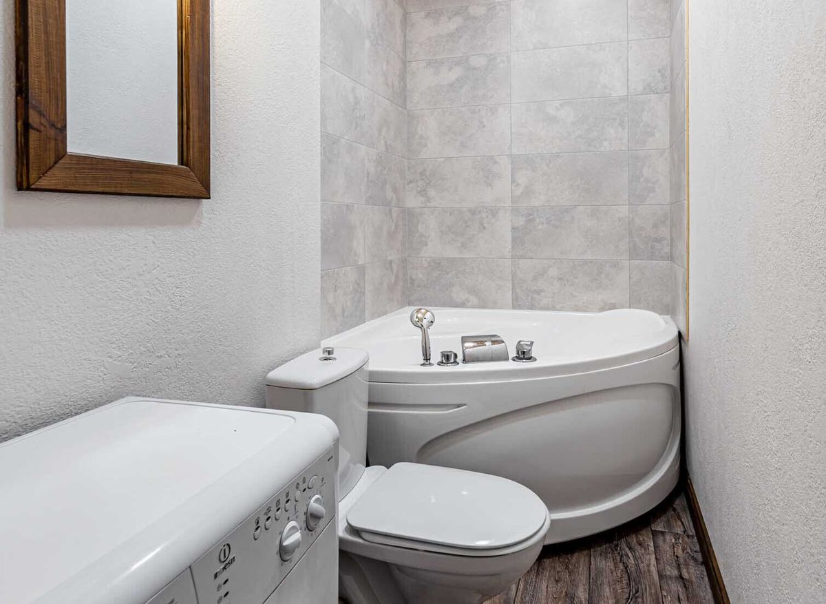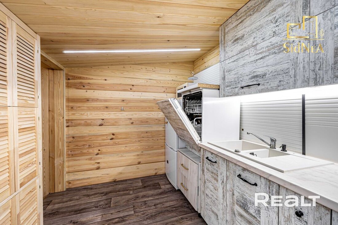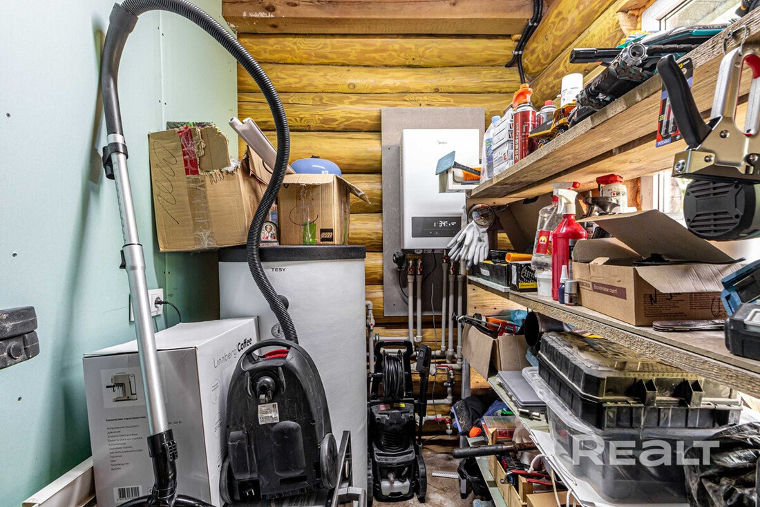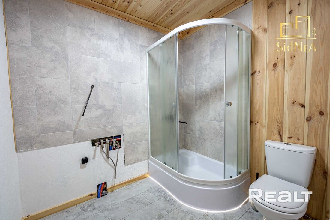 Общая площадь — 93 м2. В нем три раздельные комнаты, кухня-гостиная, раздельный санузел, котельная, прихожая. Из гостиной есть выход на террасу. Внутри все готово под чистовую отделку: электричество разведено, в стяжке — теплые полы, стены оштукатурены.
