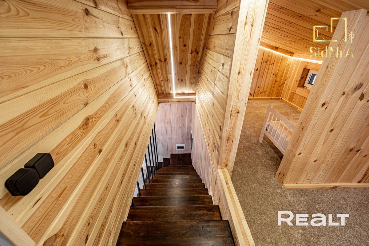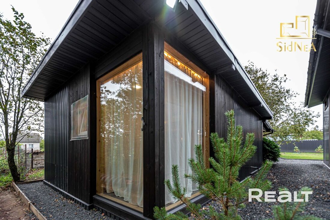 Основной дом в 2 уровня, с большим панорамным остеклением и высотой потолка до 5,5 метра. На первом уроне находятся кухня-гостиная с камином и вторым светом, санузел. На втором – две спальни и санузел.