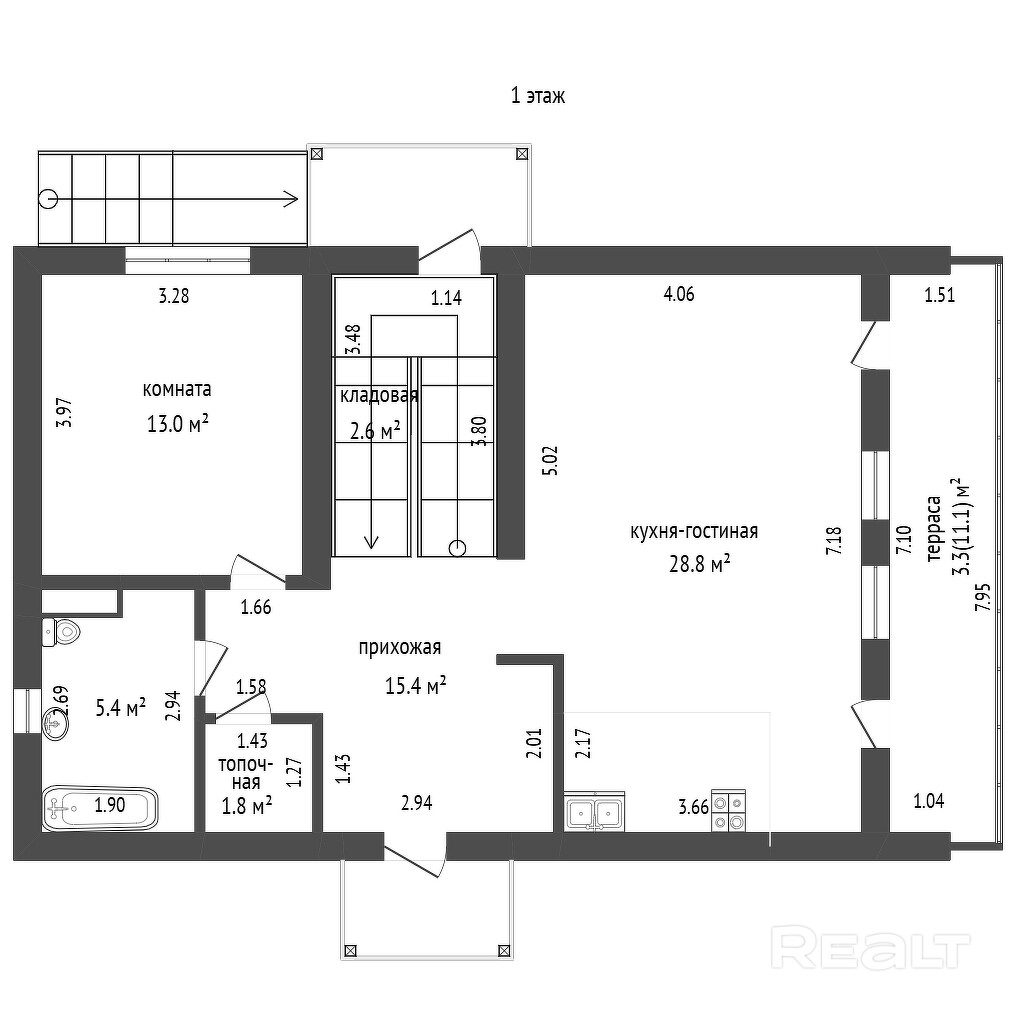 Первый этаж — зона дневного пребывания и приватная спальня. Помимо кухни-гостиной, здесь расположена спальня, санузел, подсобные помещения и терраса.