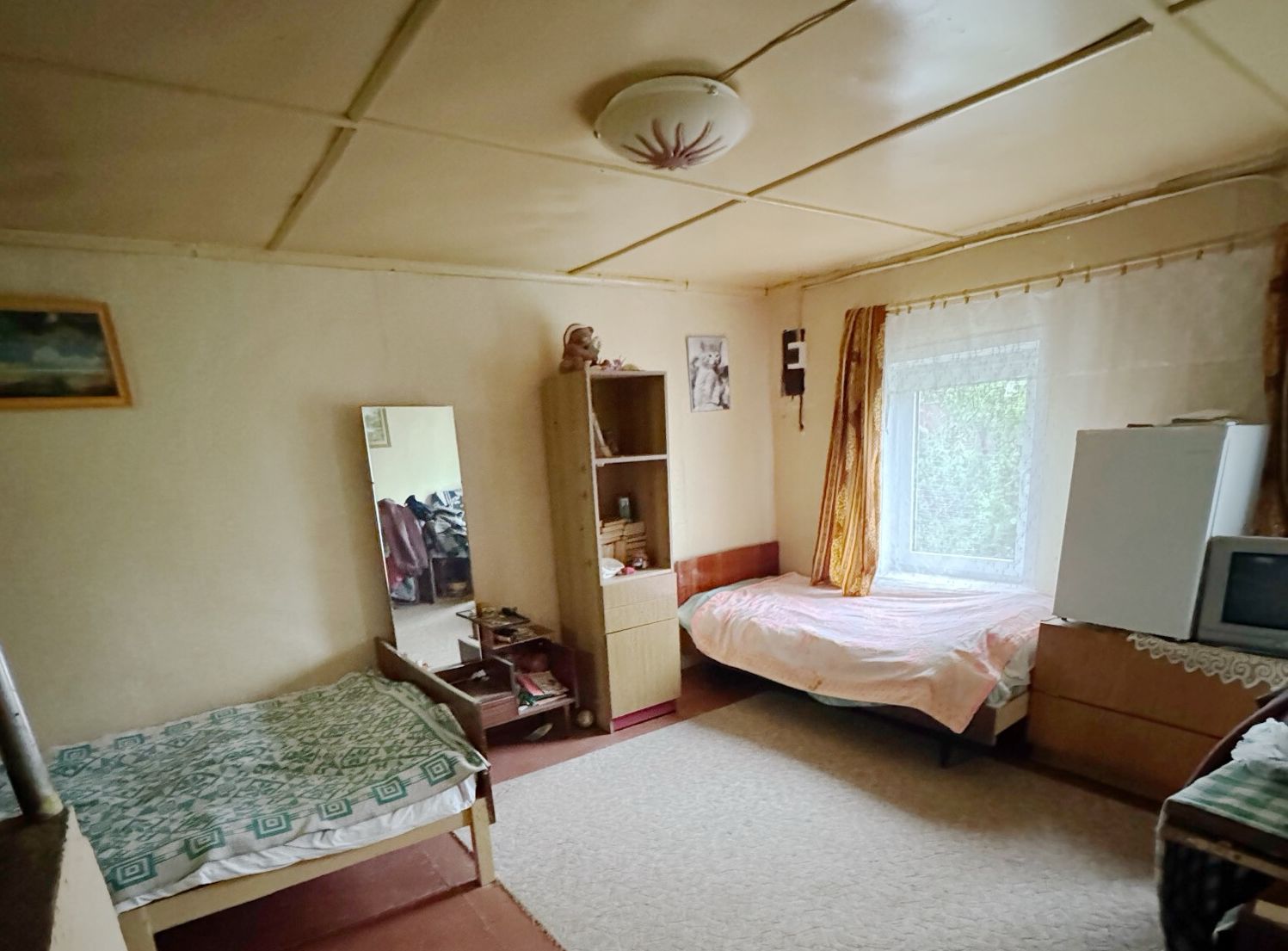 Дом деревянный, на 33,6 квадратов. Планировка такая: кухня, столовая, две жилые комнаты. Подведен сезонный водопровод, отопление печное.