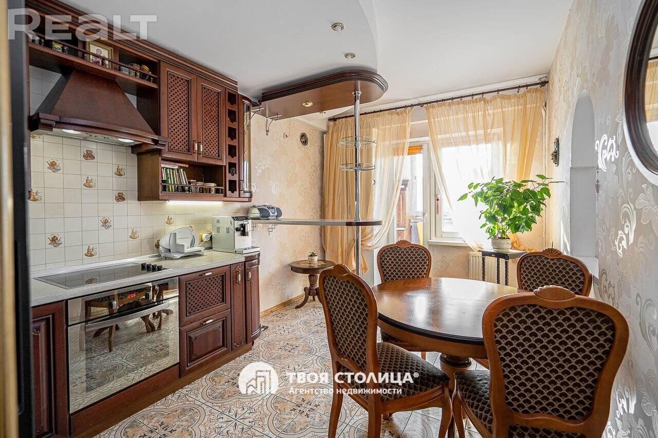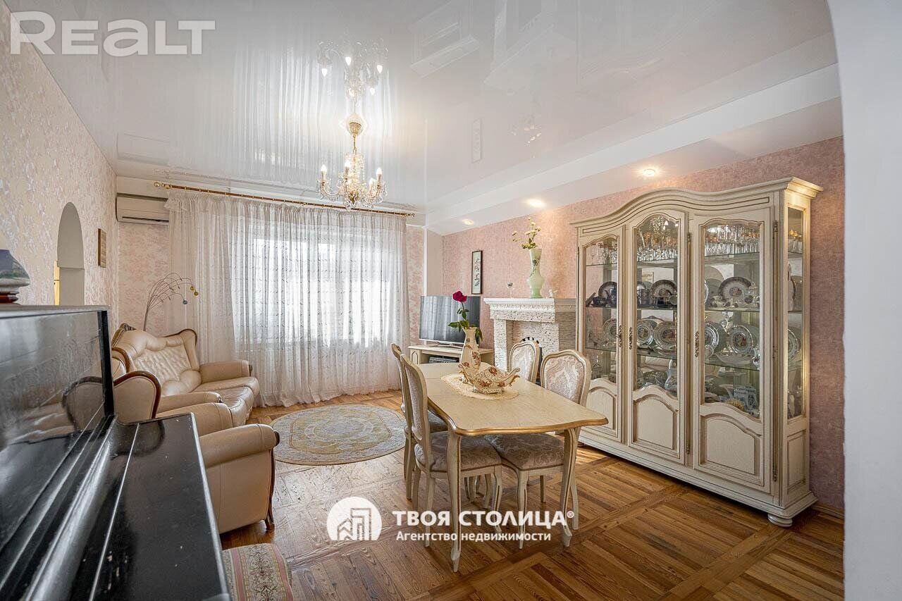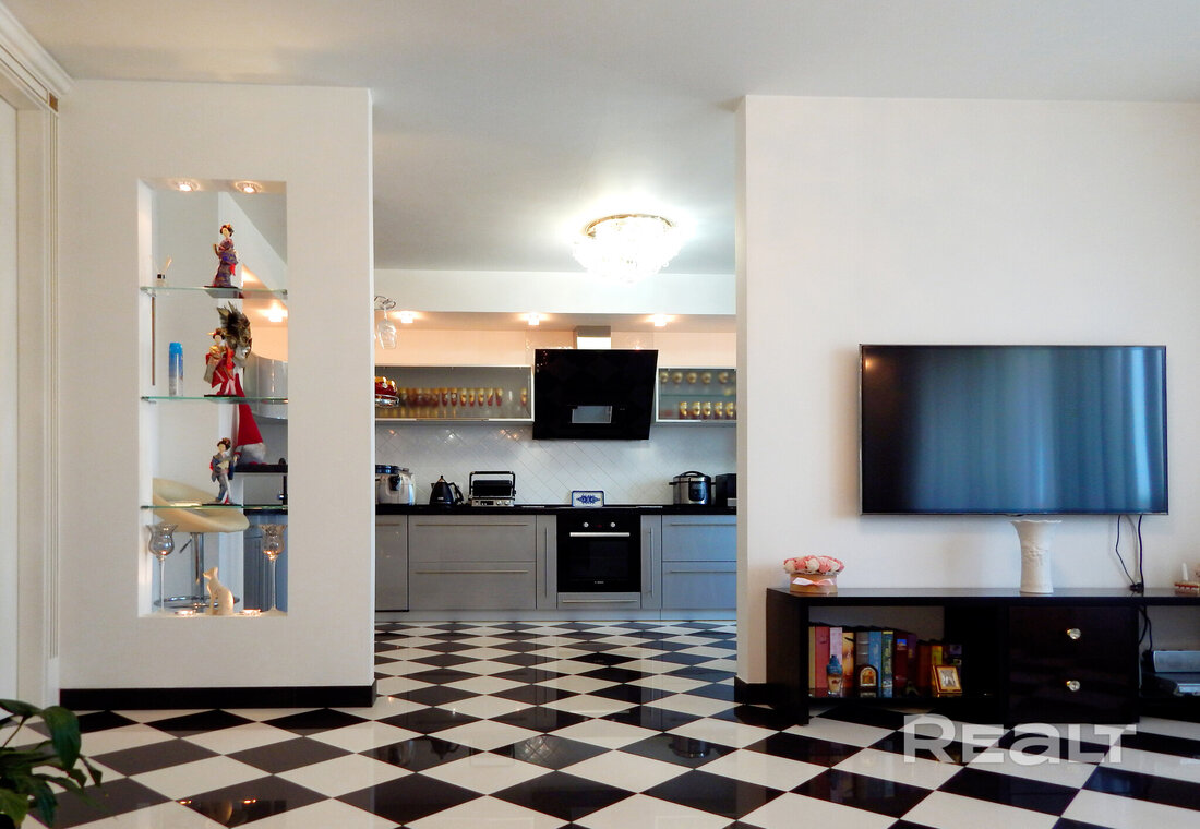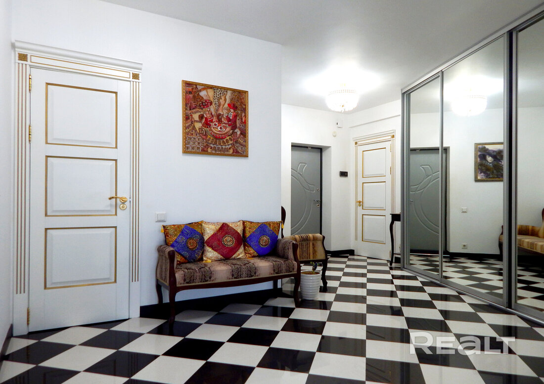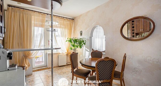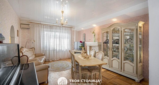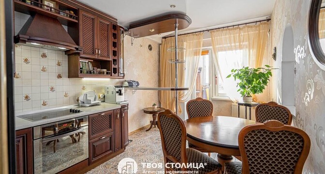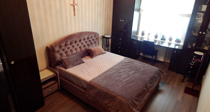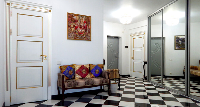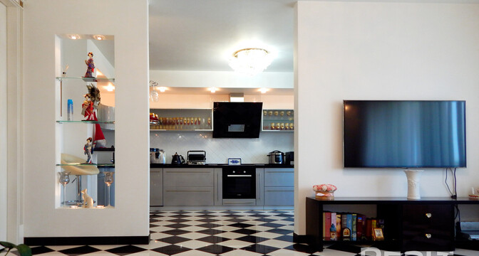 Еще одно предложение — трехкомнатная квартира с красивым ремонтом в классическом стиле. Жилье расположено на четвертом этаже. На площади в 93 квадрата разместились 3 изолированные комнаты, большая кухня, прихожая, две лоджии и два санузла. На кухне — встроенная кухонная мебель из массива (вишня, по итальянскому проекту). Варочная панель электрическая (Zanussi), встроенный духовой шкаф, посудомоечная машина (Bosch). В гостиной установлен кондиционер Hokkaido. Предусмотрены места для хранения, в том числе вместительный шкаф-купе. На этаже есть кладовая для общего пользования. Стоимость — 248 тысяч долларов (2641 доллар — за метр).