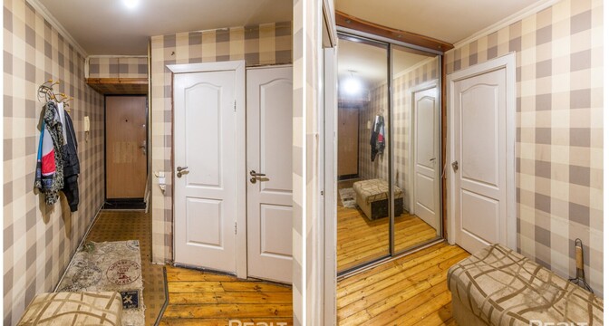 Эта квартира тоже под ремонт. Жилье с деревянными полами, стеклопакетами в окнах. Одна из комнат, что с балконом, является проходной, но она сперва ведет во второй коридор, где есть место для хранения вещей.