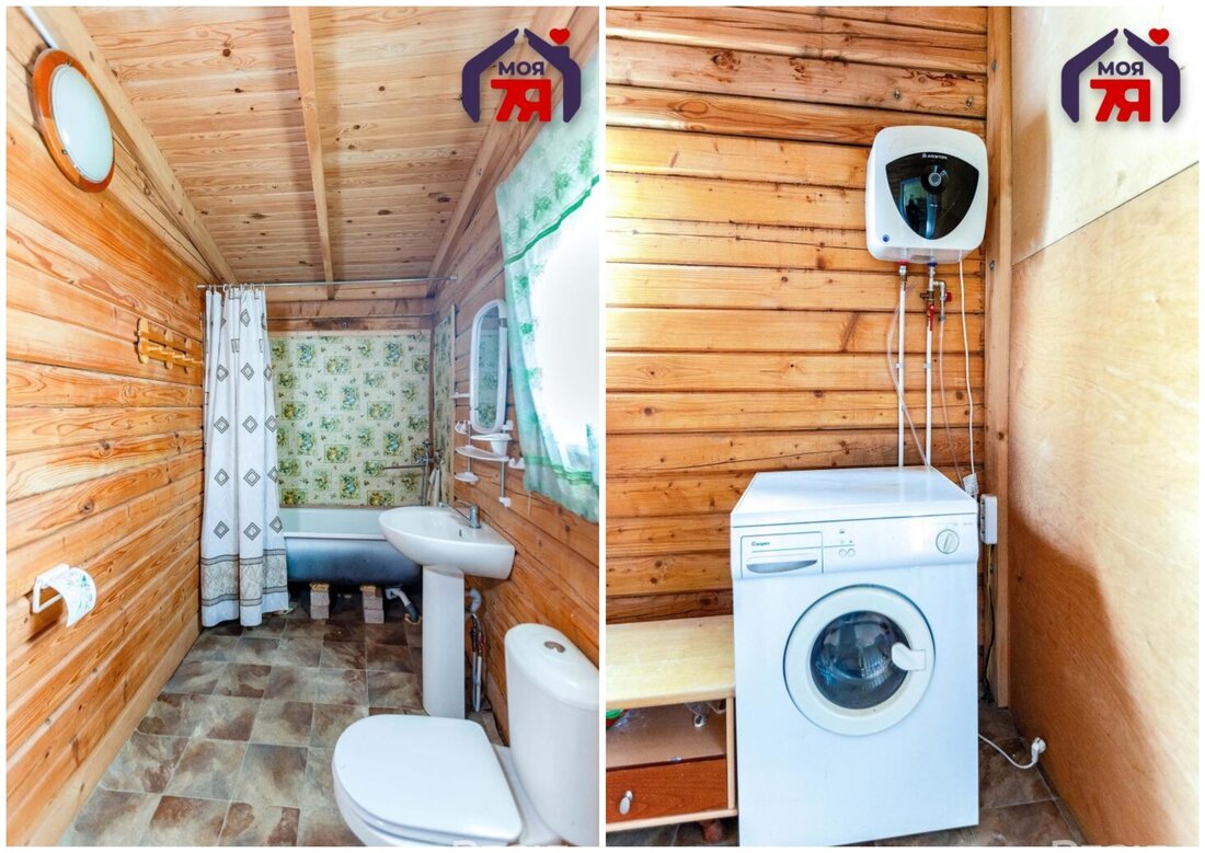 Отапливается дом печкой. Туалет и ванная комната находятся внутри дома. Канализация — местная, вода подогревается бойлером. В ванной уже установлена стиральная машина.
