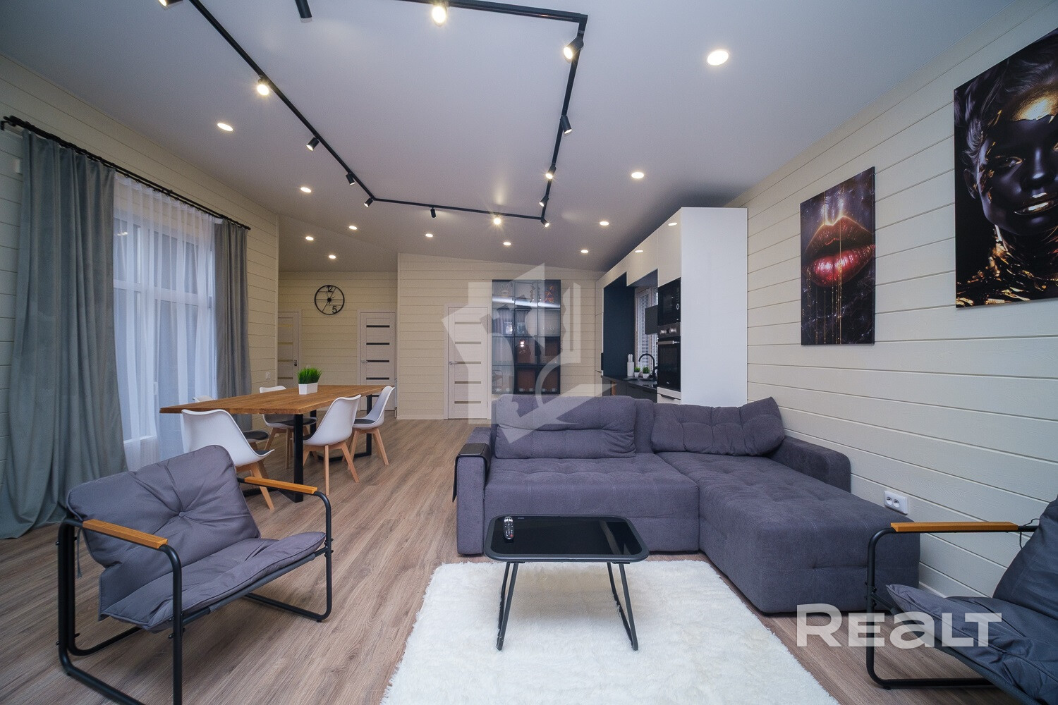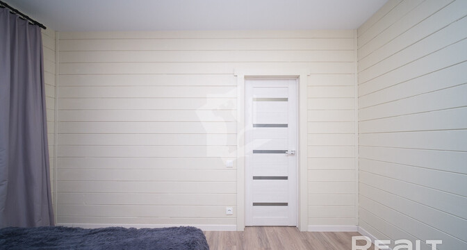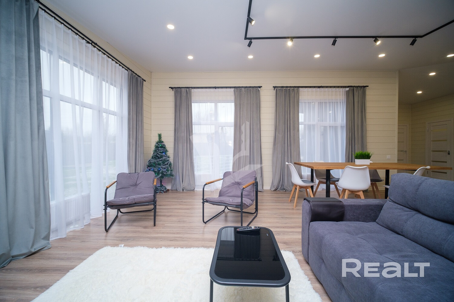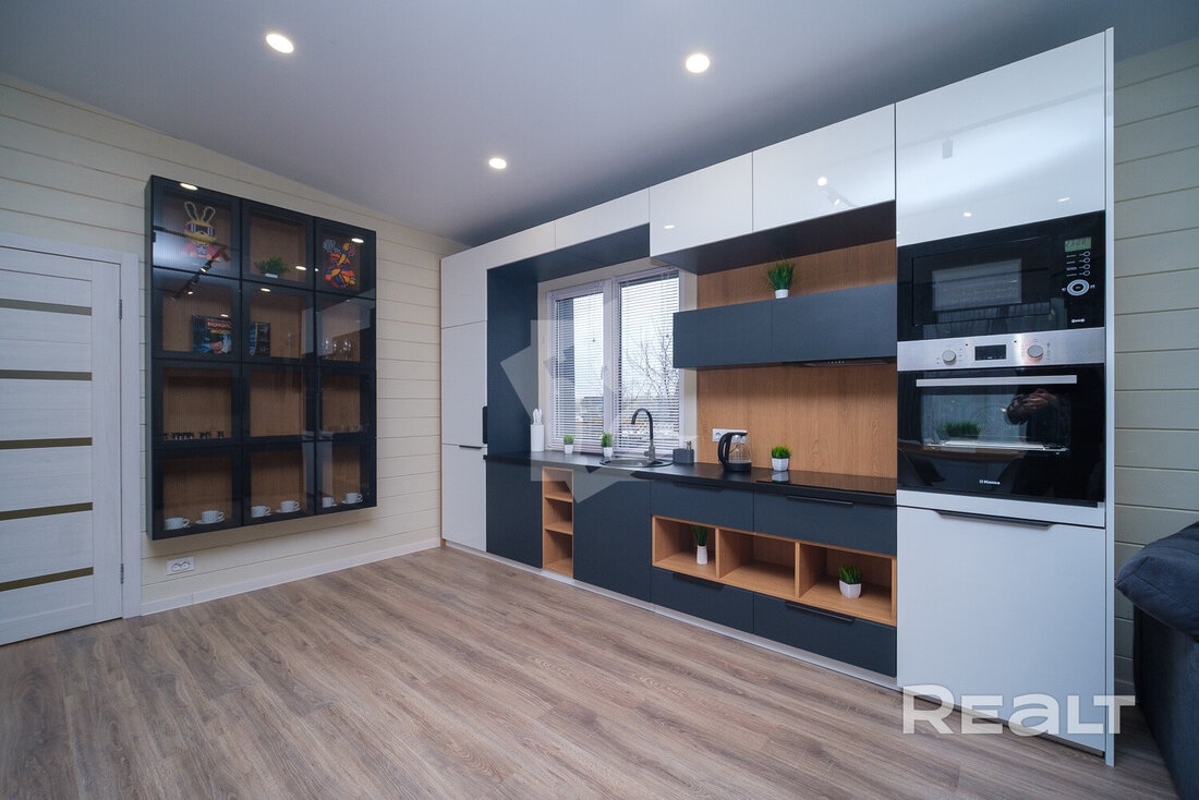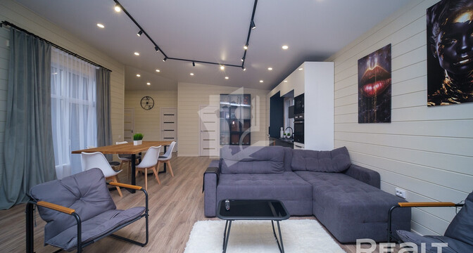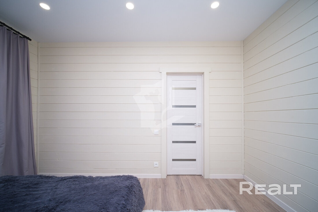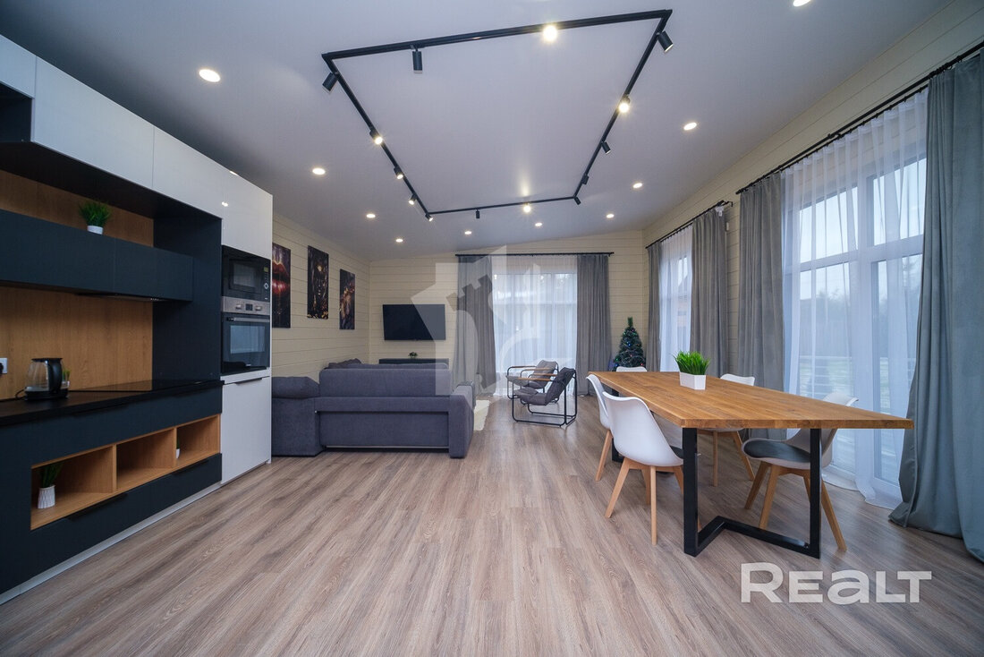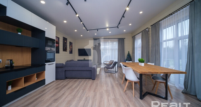 Внутри и снаружи жилье не требует вложений. Отделка — минималистичная и уютная: на полу лежит ламинат, стены отделаны имитацией бруса, продумано несколько сценариев освещения, установлены большие окна.
