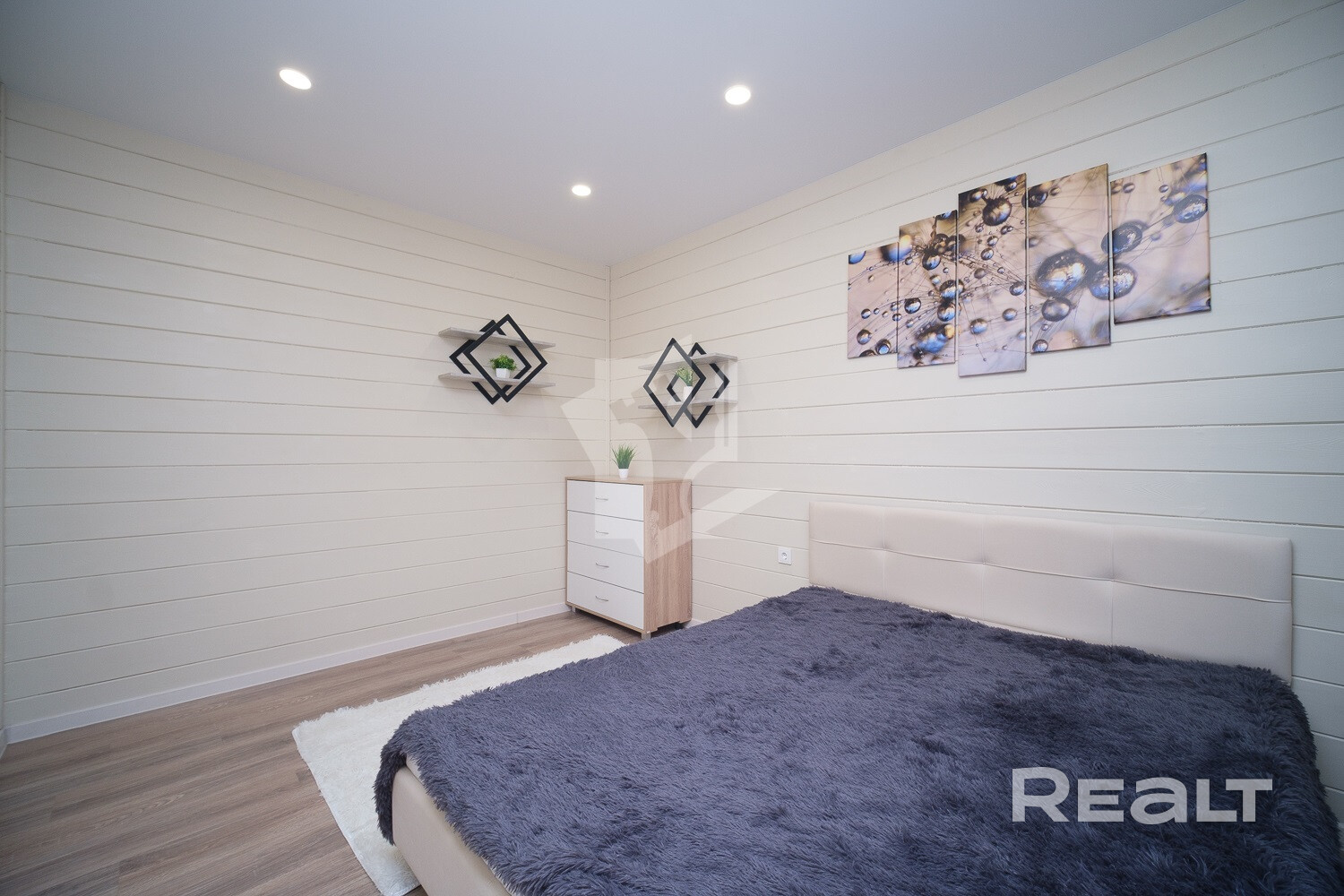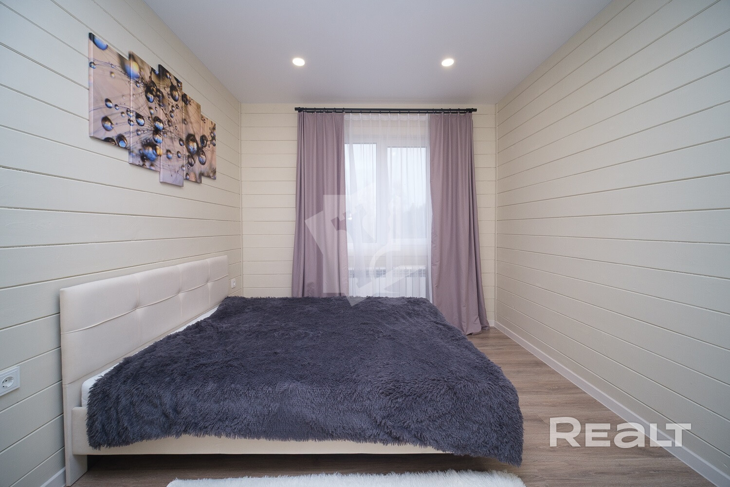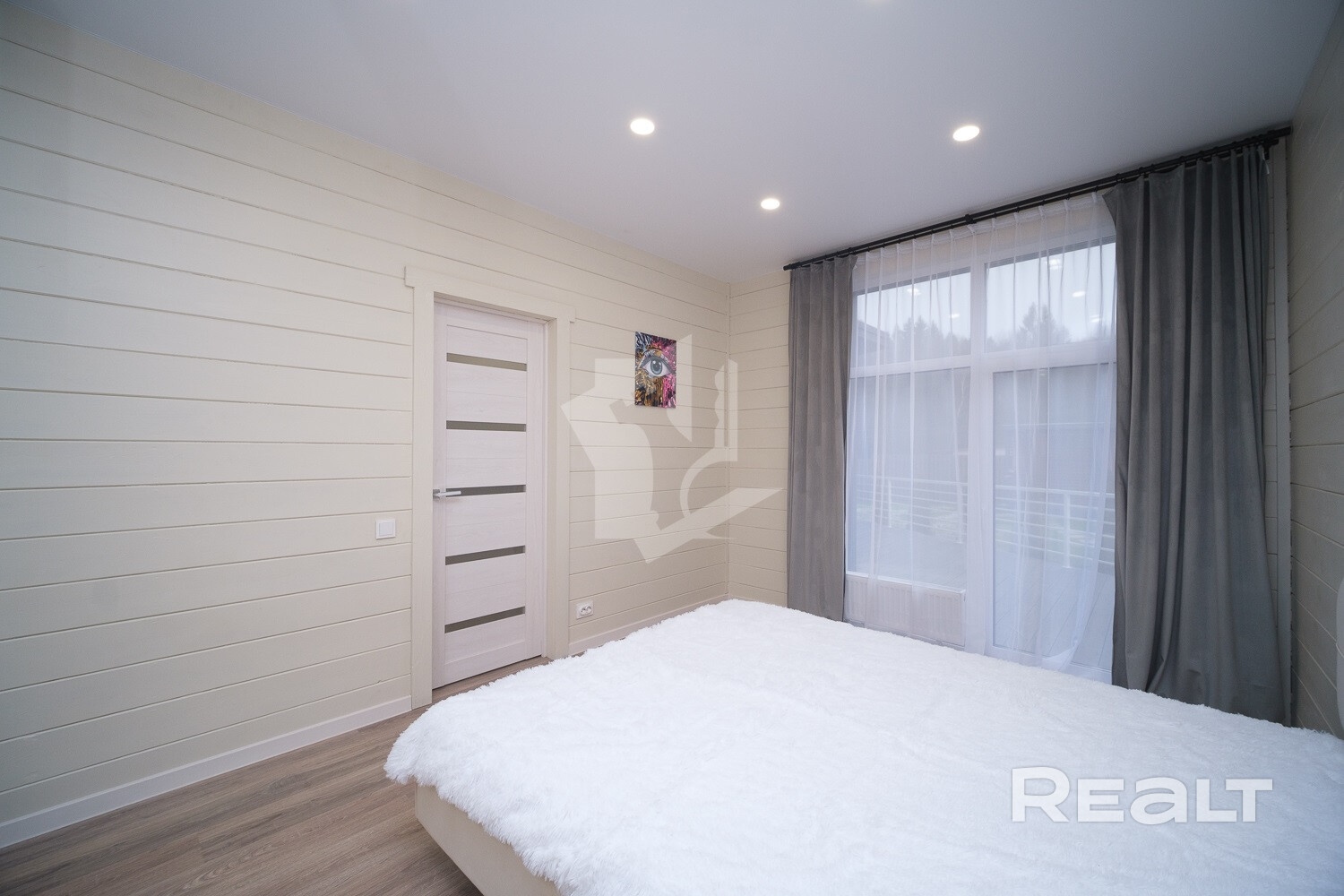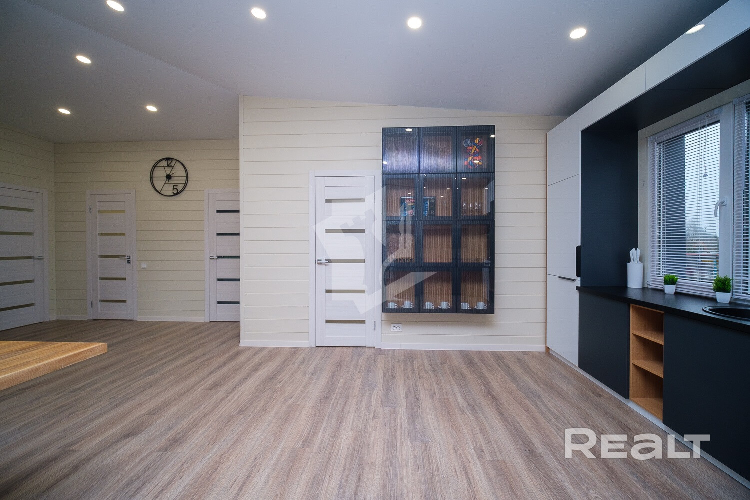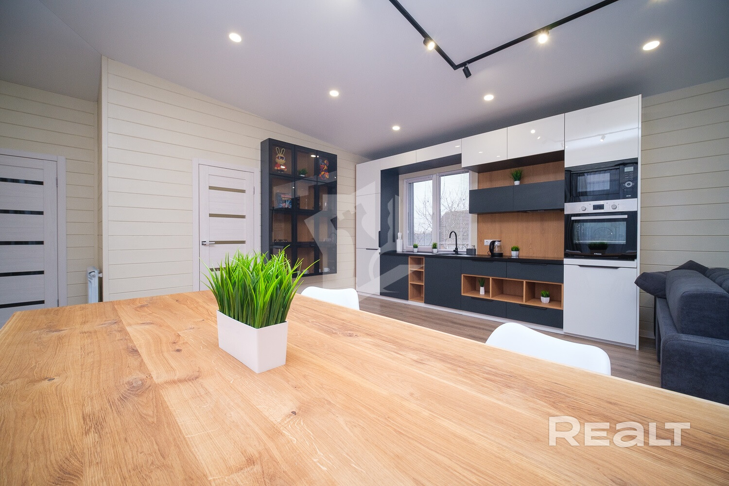 Внутри и снаружи жилье не требует вложений. Отделка — минималистичная и уютная: на полу лежит ламинат, стены отделаны имитацией бруса, продумано несколько сценариев освещения, установлены большие окна.