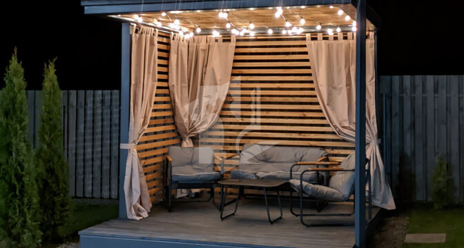 Сам участок имеет размер 7,9 сотки. Он огорожен и благоустроен: есть дорожки, высажены деревья, сделана стоянка для четырех автомобилей с электрифицированными воротами. Для отдыха построена беседка с зоной барбекю.