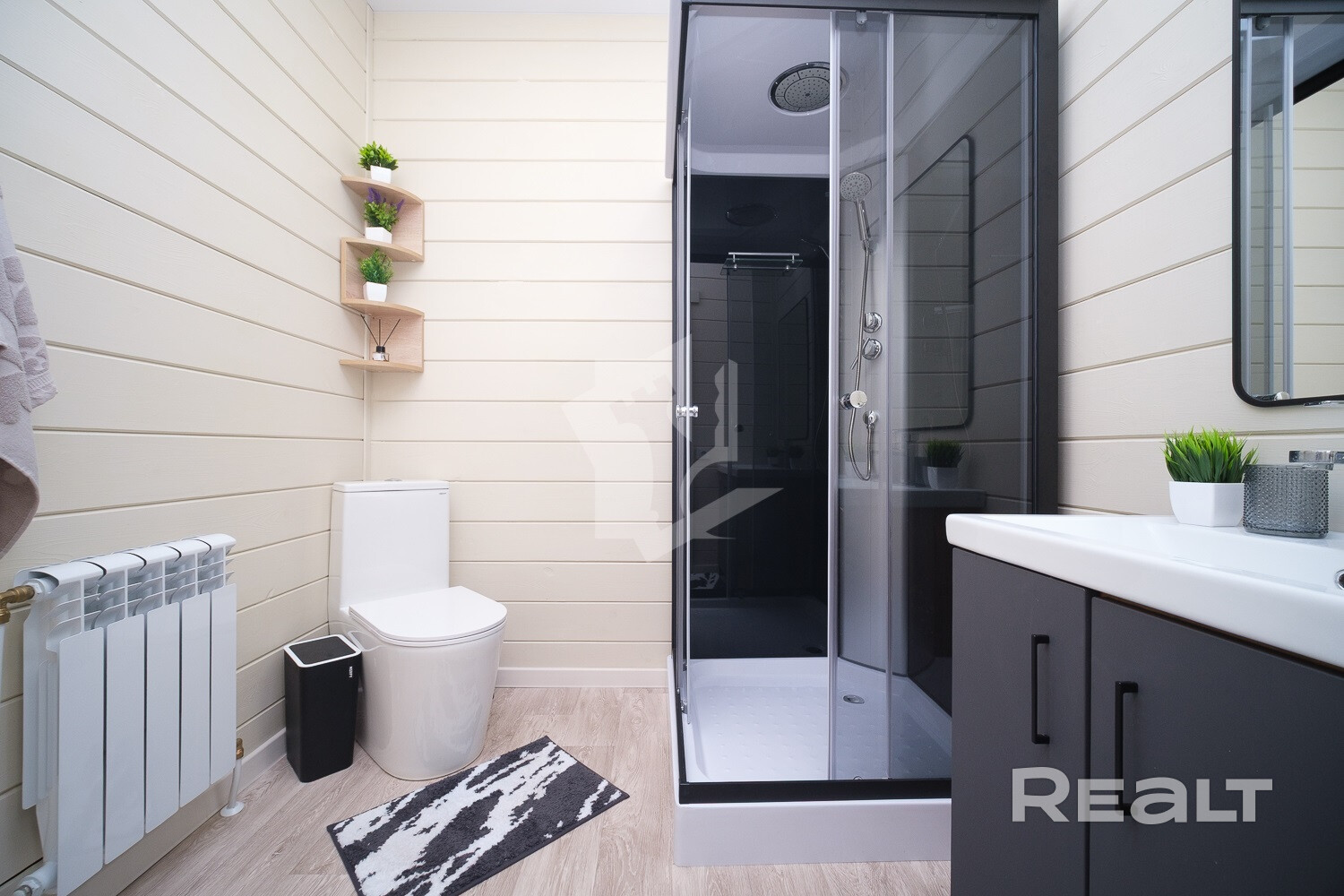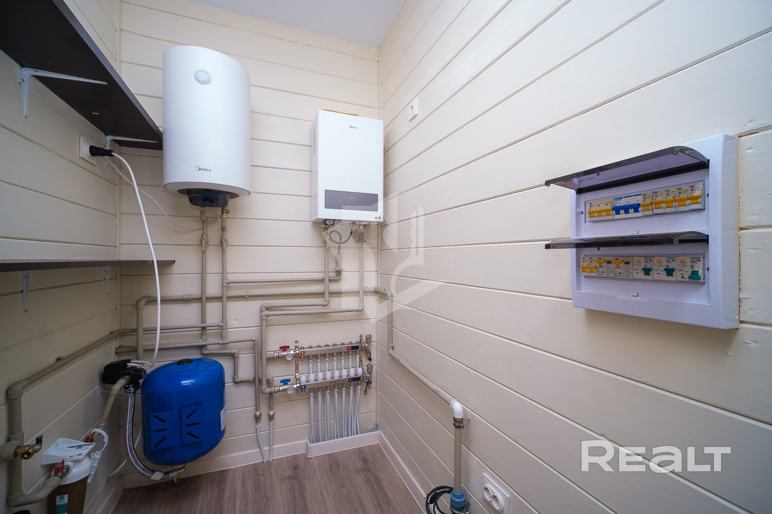 Совмещенный санузел идет с душевой кабиной. Есть в доме и отдельная котельная. Отопление работает на электричестве. Вода поступает из скважины, а канализация — местная.
