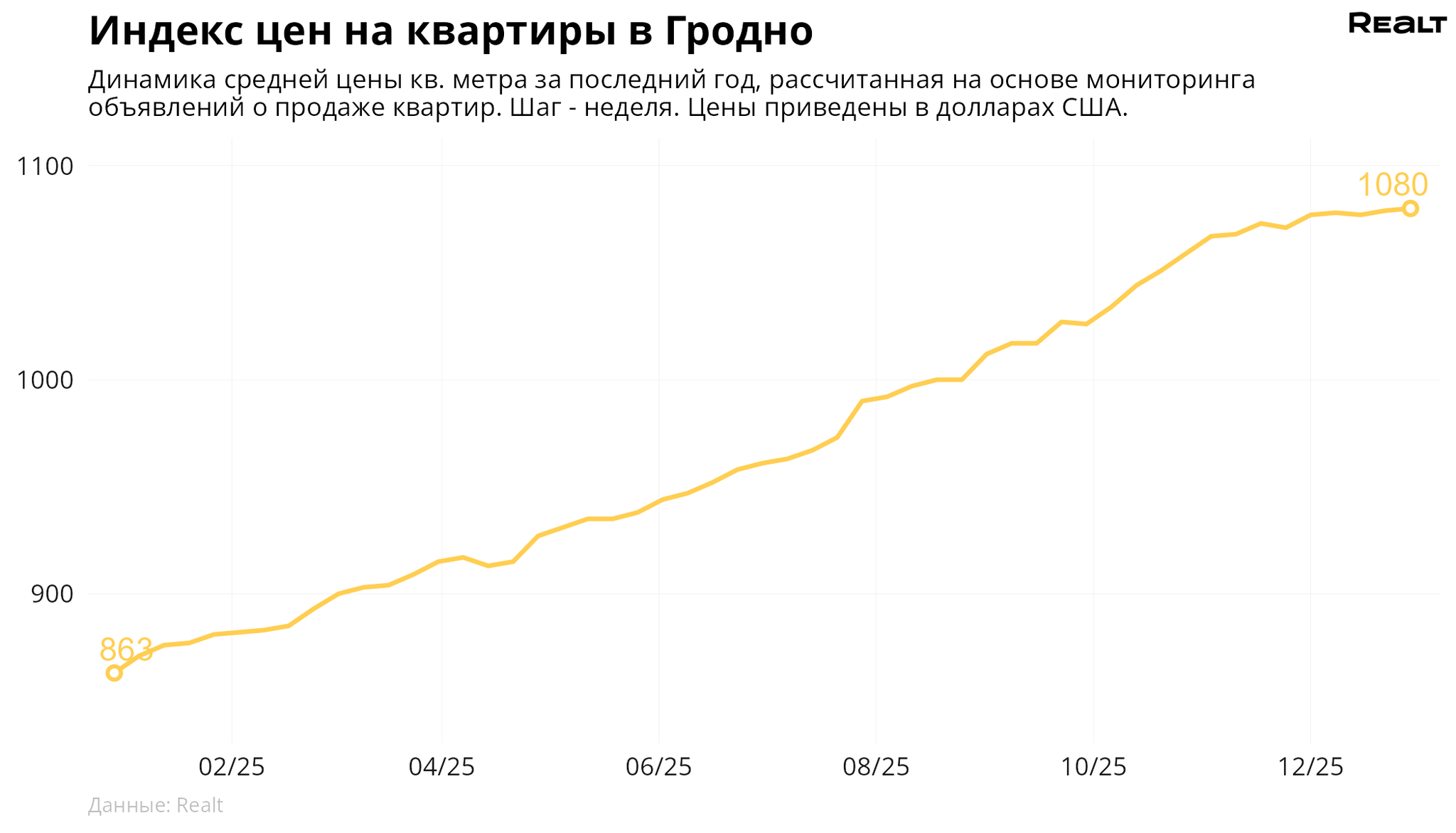 За неделю, с 22 по 29 декабря 2025 года, средняя цена в объявлениях о продаже квартир в Гродно выросла на 0.1% и составила 1080 $/м2. При этом количество квартир в продаже уменьшилось на 1.7%. Что еще произошло на рынке жилья крупнейших городов Гродненской области за семь дней — в материале.