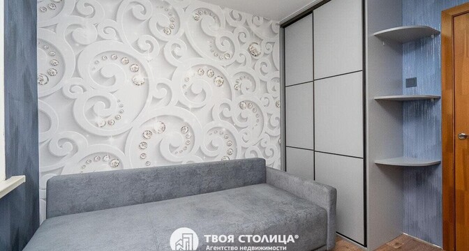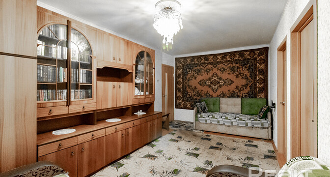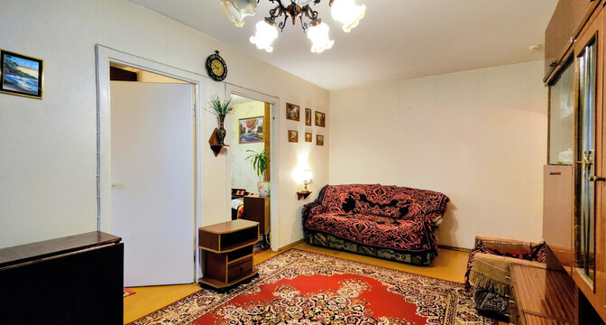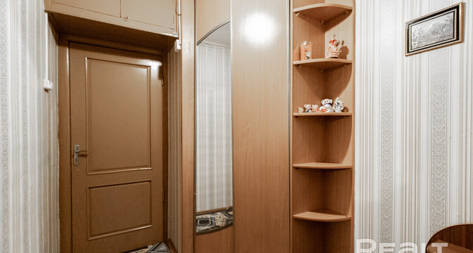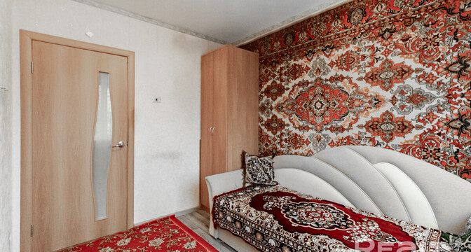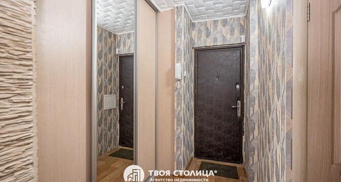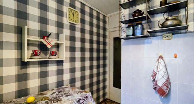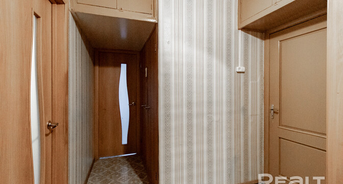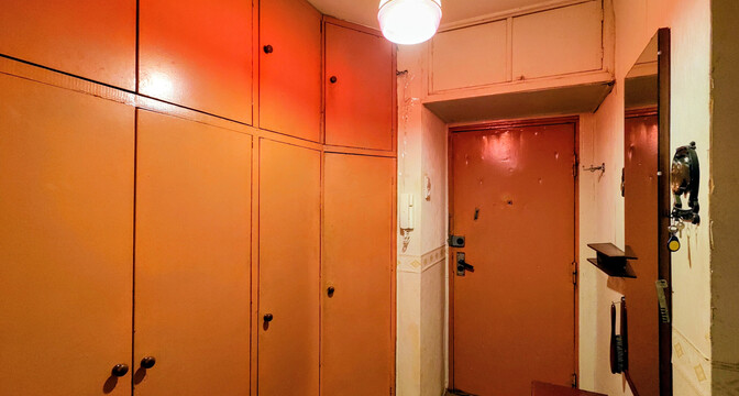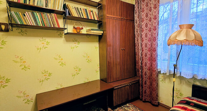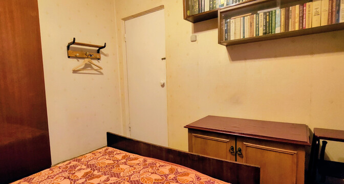 Квартира нуждается в обновлении. Планировка схожа с предыдущими: одна проходная комната, где также имеется выход и на балкон. В окнах стоят стеклопакеты, стены оклеены обоями, на полу лежит деревянное покрытие. В коридоре помещается шкаф.