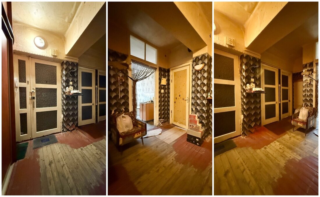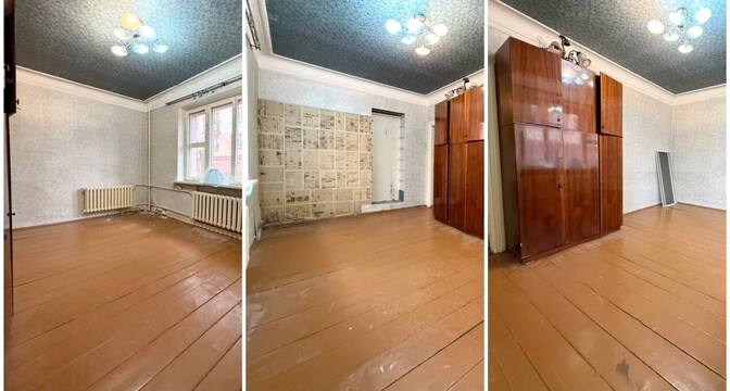 Сталинка нуждается в ремонте. Здесь почти вынесена вся мебель и техника. На полу преимущественно деревянное покрытие, а в окнах — стеклопакеты. Высота потолков достигает 2,98 метра. Кстати, одна из комнат — проходная.