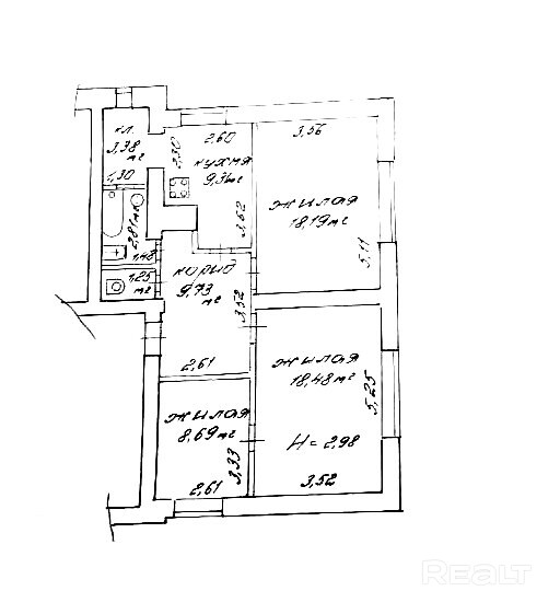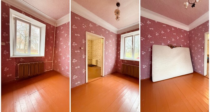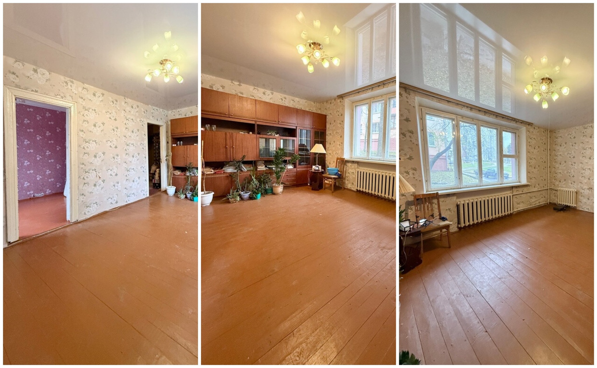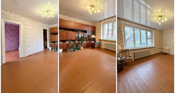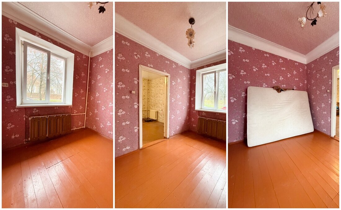 Квартира требует ремонта. Тут лежат дощатые полы, стоят деревянные рамы в окнах. Одна из комнат — проходная. Кстати, есть здесь и лоджия. Она занимает длину двух комнат, но выход находится только в одной.