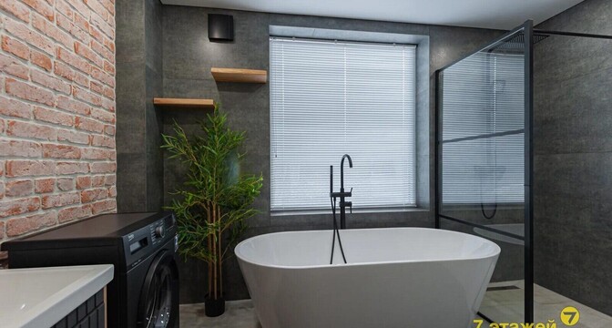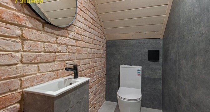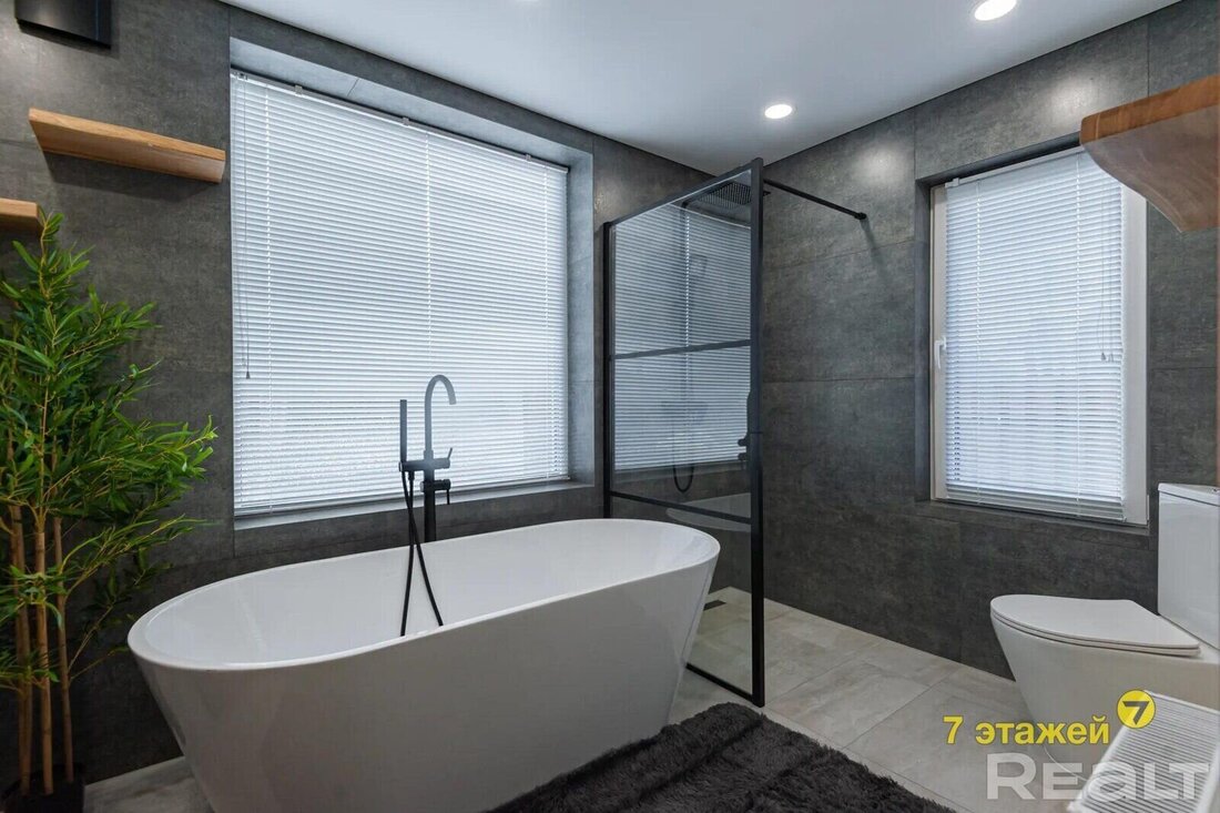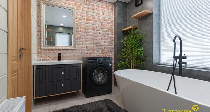 Санузлов в доме два — по одному на каждом уровне. На первом этаже он совмещенный, с ванной, душем и стиральной машиной. Отапливается дом на газу, вода поступает из скважины, а канализация — местная.