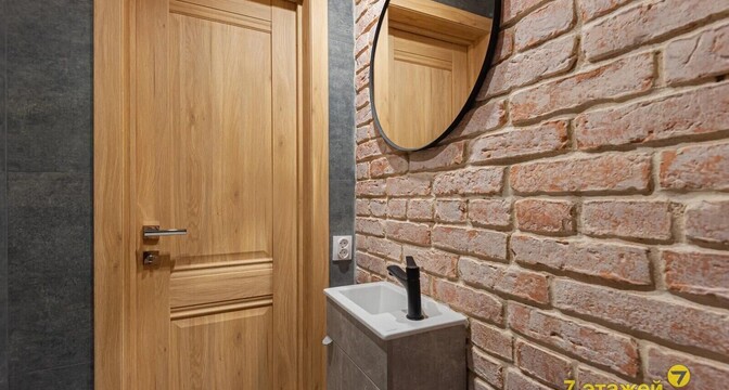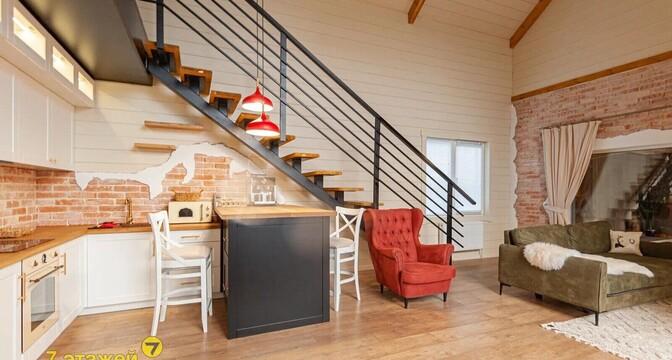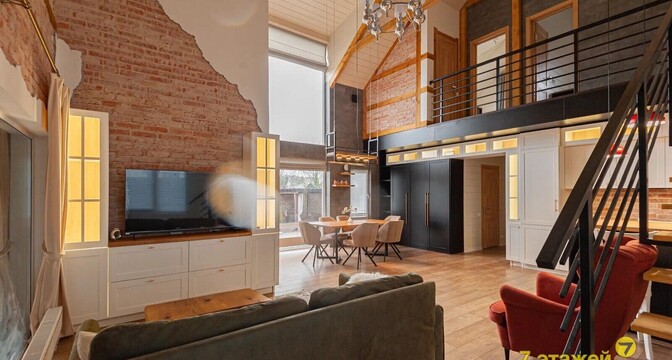 Самая большая комната — совмещенная кухня-гостиная. Объема ей придают большие окна и второй свет. В отделке гармонично сочетаются между собой кирпич, имитация бруса и декоративная штукатурка. Теплые оттенки разбавляет темная лестница и яркая мягкая мебель. Здесь все готово к проживанию, ведь после покупки в доме остаются мебель и техника.