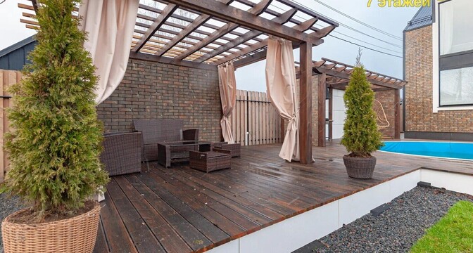 Потрудились владельцы и над участком в 6,13 соток. Тут сделаны дорожки, установлен бассейн, терраса и место для барбекю. По периметру дом огорожен, установлены ворота с электроприводом.