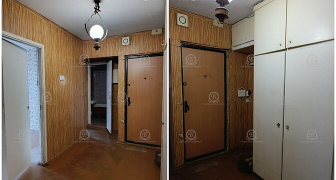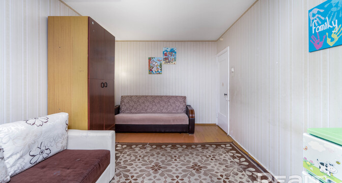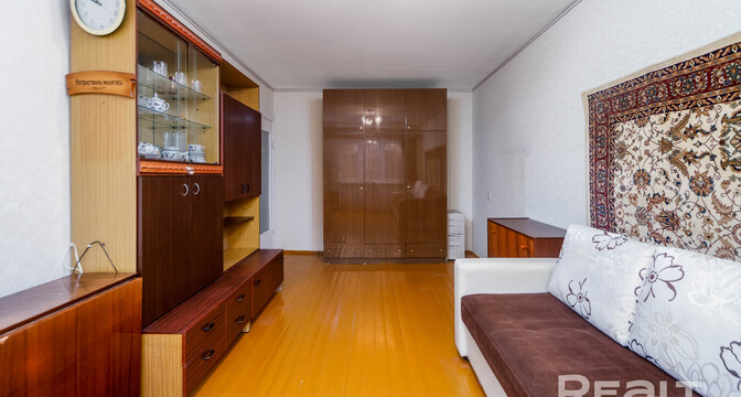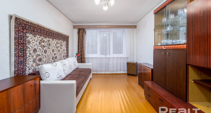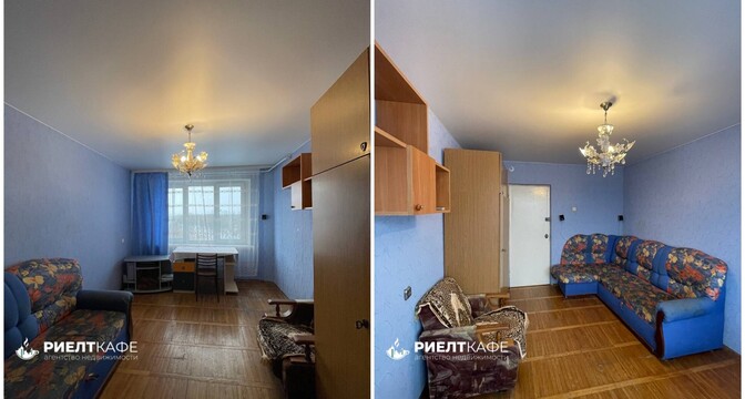 Квартира также нуждается в ремонте. Планировка похожа на предыдущую квартиру. Здесь тоже одна проходная комната и два балкона. В окнах стоят стеклопакеты, на полу лежит паркет.