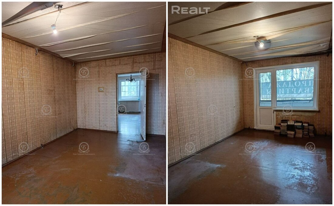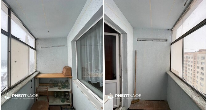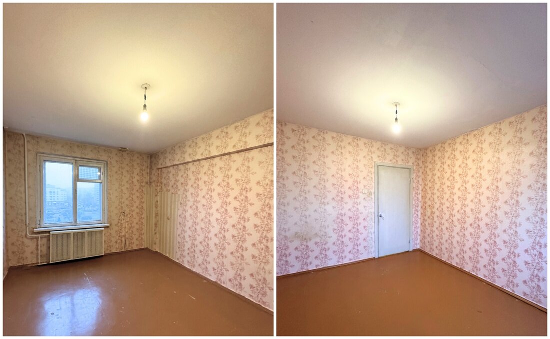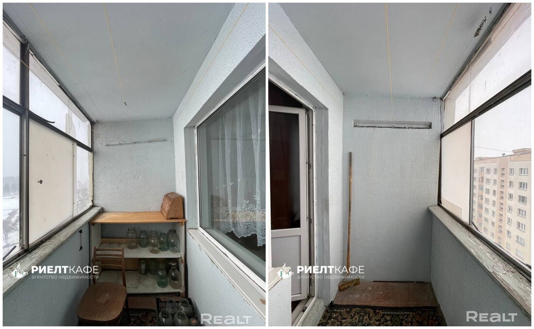 Эта трешка под ремонт. Здесь старые рамы, лежит разное покрытие на полу. В комнатах нет мебели и техники. Тут тоже две лоджии, которые выходят на разные стороны дома, и одна проходная комната.
